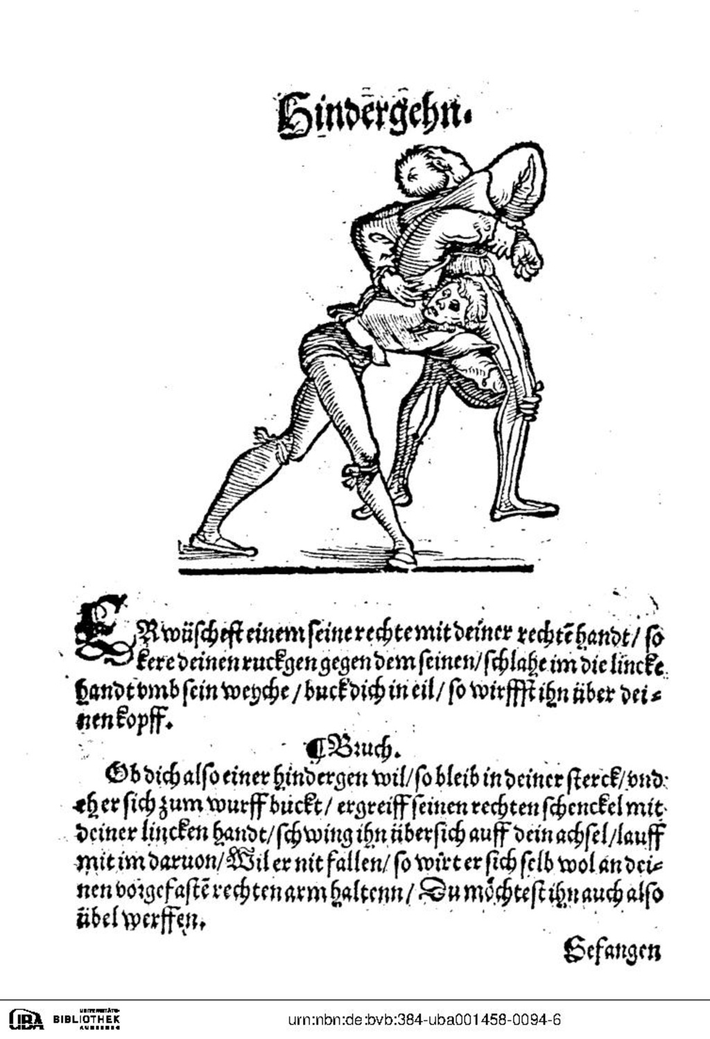 Ob dich also einer hindergen wil, so bleib in deiner sterck, und eh er sich zum wurff buckt, ergreiff seinen rechten schenckel mit deiner lincken handt, schwing ihn übersich auff dein achsel, lauff mit im darvon, Wil er nit fallen, so wirt er sich selb wol an deinen vorgefasten rechten arm haltenn, Du möchtest ihn auch also übel werffen.
