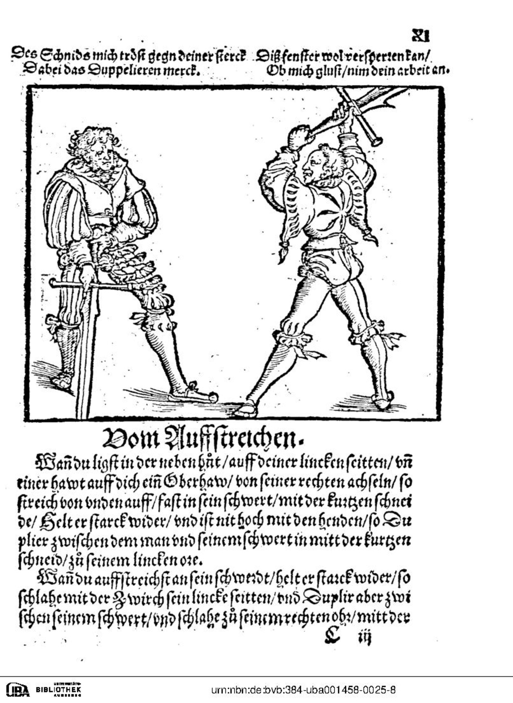 Wann du auffstreichst an sein schwerdt, helt er starck wider, so schlahe mit der Zwirch sein lincke seitten, und Duplir aber zwischen seinem schwert, und schlahe zu seinem rechten ohr, mitt der