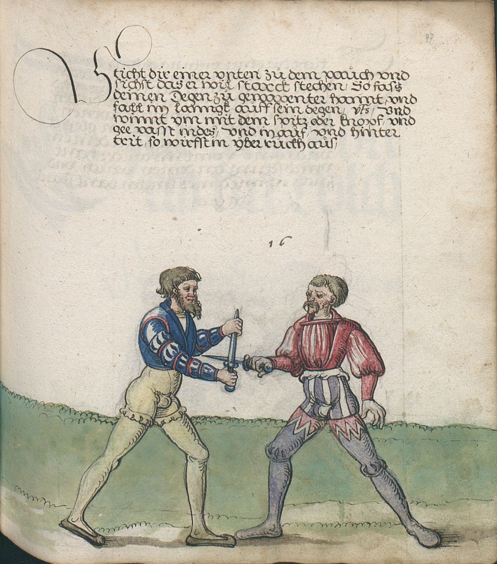 Sticht dir einer unten zu dem pauch und sichst das er will starck stechen, So faß deinen Degen zu gewapenter hannt, und fall im lanngk auff sein degen, ut supra, Und winnt ym mit dem spitz oder knopf, und gee vasst indes, Und in auf, und hinter trit, so wirfst in ÿber ruckh aus.