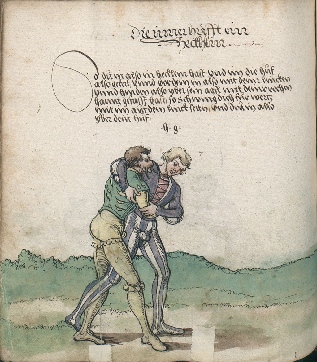 So du in also in hecklein hast, und im die huf also gekert, unnd vor dein in also mit deinr lincken unnd hinden also yber sein agsl mit deinr rechtn hannt gefasst hast, so schwing dich fur wertz mit im auf dein linck seitn, und dra in also ÿber dein huf.