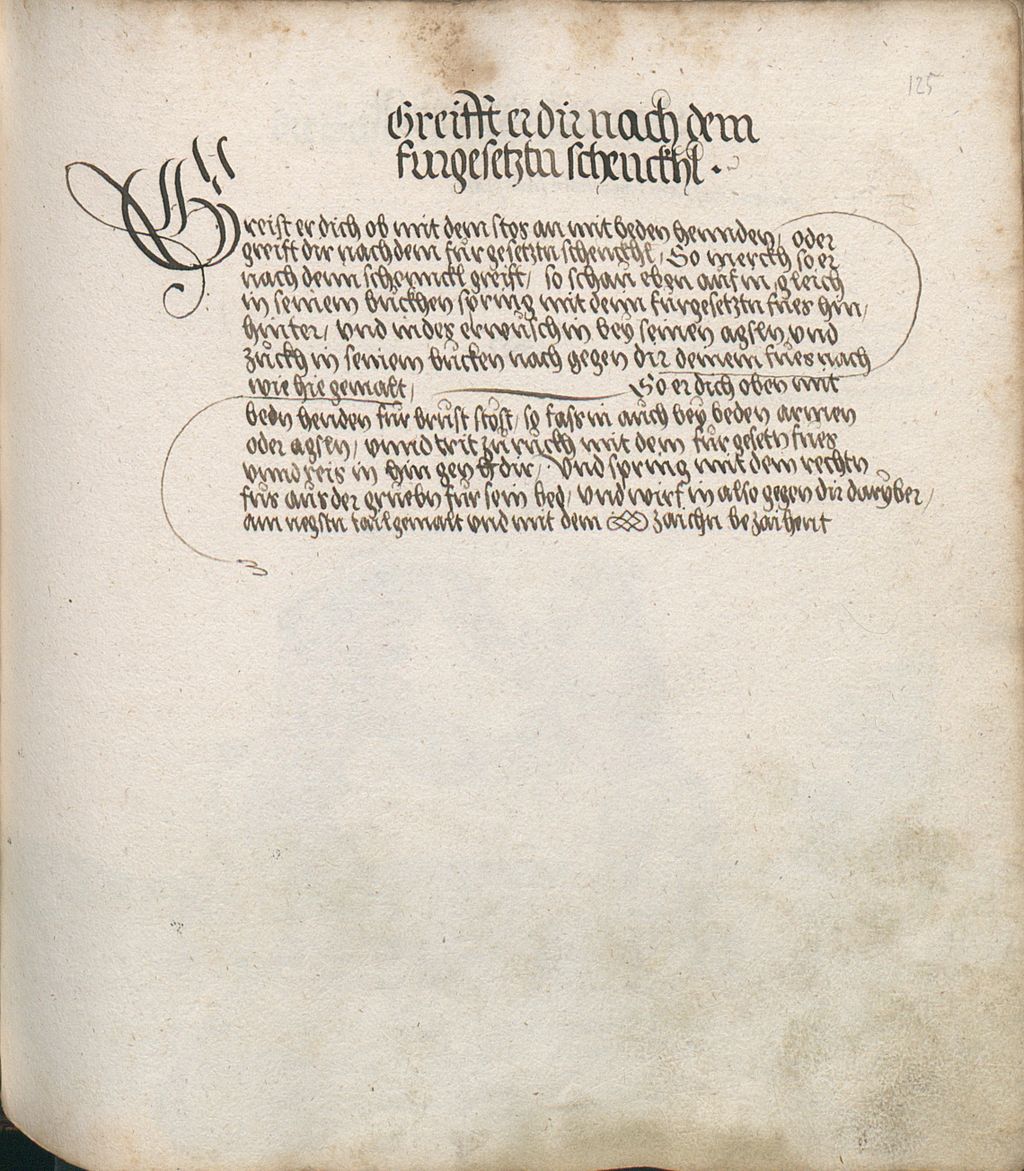 Greift er dich ob mit dem stos an mit beden hennden, oder greift dir nach dem furgesetztn schenckhl, So merckh so er nach deim schennckl greift, so schau eben auf in, gleich in seinem buckhen spring mit deim furgesetztn fues hin, hinter, und nider erwisch in beÿ seinen agsln und zuckh in seinem bucken nach gegen dir deinem fues nach wie hie gemalt.