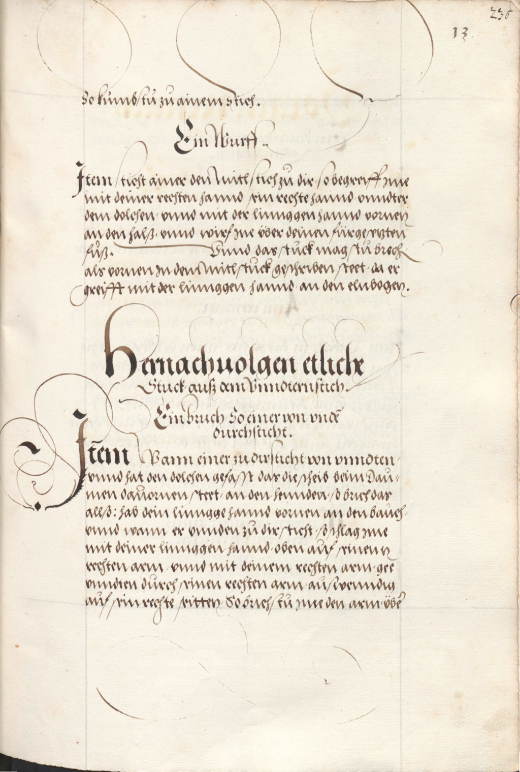 hab dein linngge hannd vornen an den bauch / vnnd wann er vnnden zu dir sticht / so schlag jme mit deiner linnggen hannd / oben auf seinenn rechten arm / vnnd mit deinem rechten arm / gee vnndten durch seinen rechten arm / auswenndig auf sein rechte seitten / So brichstu jme den arm über