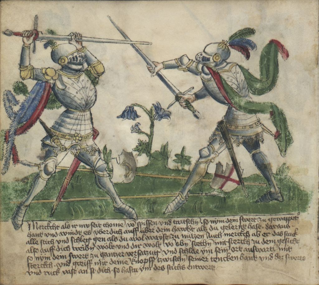 Merckcht als ir nw seit chomen von spissen vnd tartschen . so nym dein swert zu gewappet[er] hant vnd windt es vberdich auff über dein hawbt als du gelernt hast . daraus - alle stich vnd schleg gen als du wol wayst zu nützen Auch merckch ab er das stuck also auff dich treiben wölt vnd dir wölt von oben stechen mit sterckh zu dem gesicht so nym dein swert zu gantzer versatzung vnd schlae ym seinen ort auswartz mit sterckch . vnd greiff mit deinem knopff tzwischen seiner tencken hant vnd dez swerts vnd ruck vast an dich[1] . so hastu ym des stichs entwert
