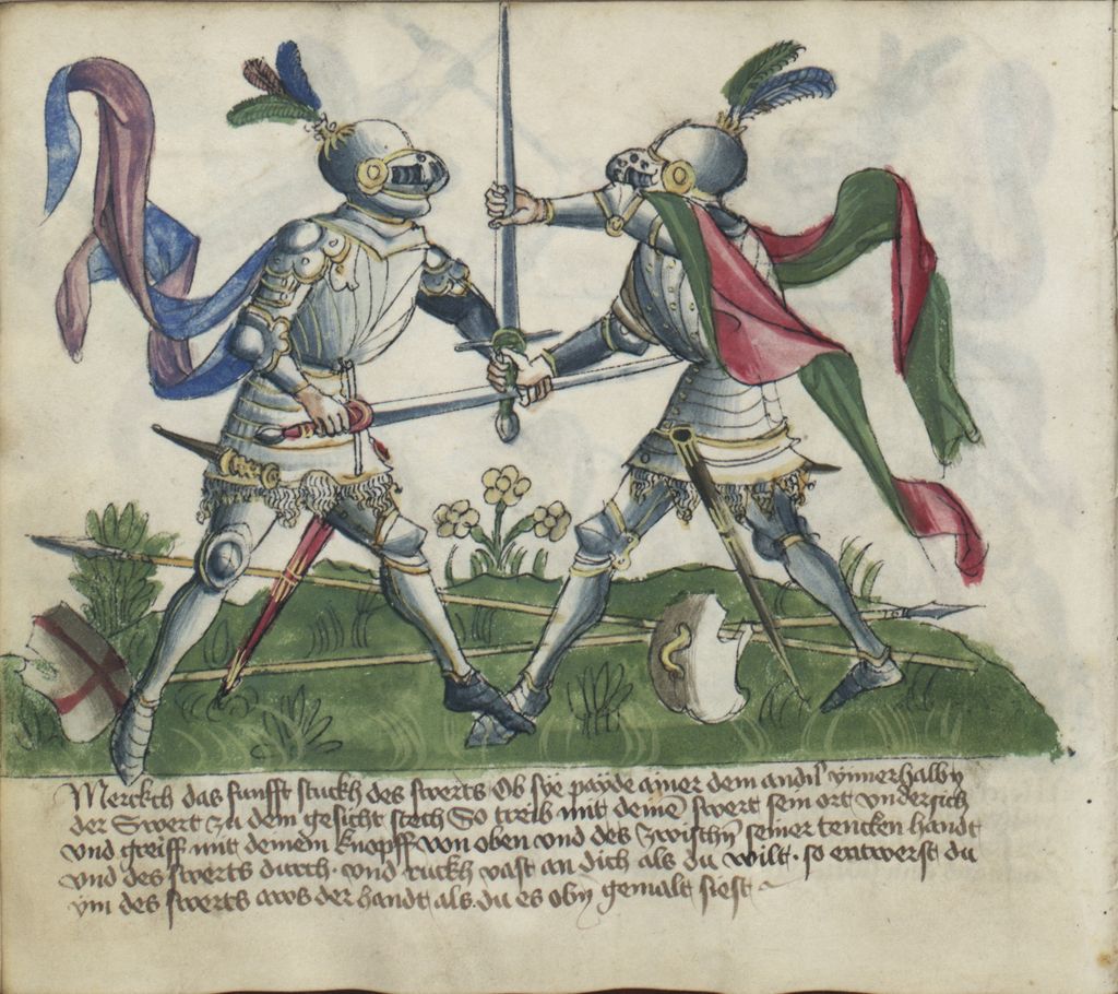 Merckh das sechst stuckh des swerts Ob er den rechten fueß . hett gesetzt für vnd schlug dir oben den mortdslag zu dem hawbt So vahe den schlag zwischen bayder deiner hennde auf dem swert vnd schreit mit deinem tencken fueß ausserhalb seins rechten fueß vnd greif mit deinem ort an seinen hals zu der tencken seyten So würfst du In vber ruck als du es oben gemalt siest –