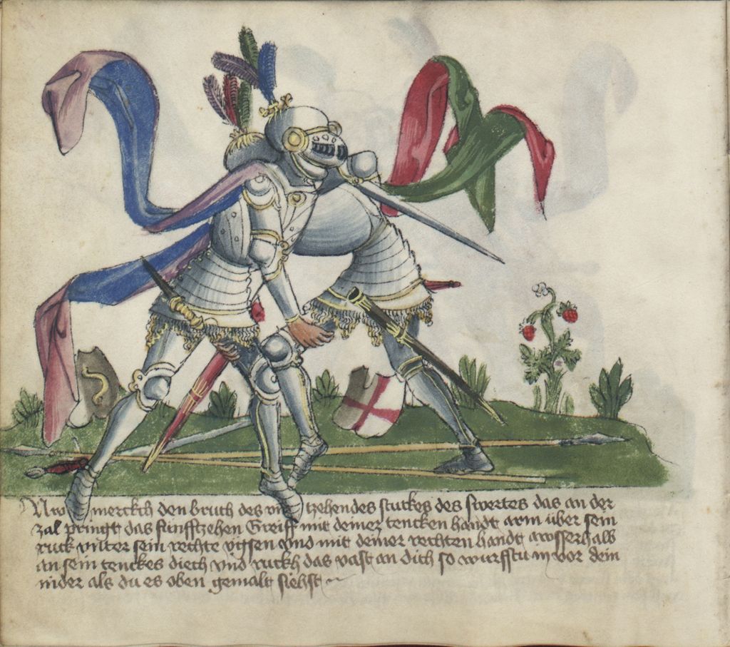 Nw merckch den bruch des virtzehendes stuckes des swertes das an der zal pringt das fünfftzehen Greiff mit deinem tencken arm über sein ruck vnter sein rechte vgsen vnd mit deiner rechten handt awsserhalb an sein tenckes diech vnd ruckh das vast an dich so wurfstu in vor dein nider als du es oben gemalt siehst –
