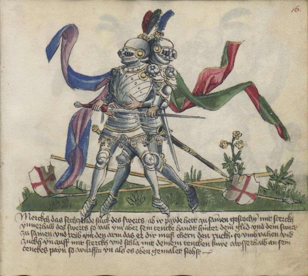 Merckch das sechtzende stuck des swerts / ab ir payde hett zu sammen gestochen mit sterckh ynnerhalb des swerts so vah ym aber sein tencke handt hinter dem glid vnd dein swert zu sammen vnd reib ym den arm das er dir muß chern den ruckh . so vmb vahen vnd zuckh yn auff mit sterckh vnd schla mit deinem tencken knye awsserhalb an sein tenckes payn so würfstu yn als [du] es oben gemalet siehst –