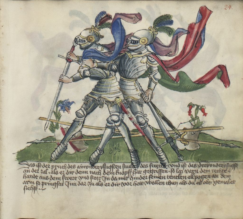 Das ist der pruch des ainvndreyßigsten stucks des swerts vnd ist das dreyvndreyßigst[1] an der zal . als er dir denn nach dem knopff hat gegriffen . So laz varn dein rechte – handt aus dem swert vnd stozz In da mit hinder seinen tencken ellpogen an dem arm so pringstu Inn dar zu als er dir vor hett wöllen thun als du es oben gemalet siehst –