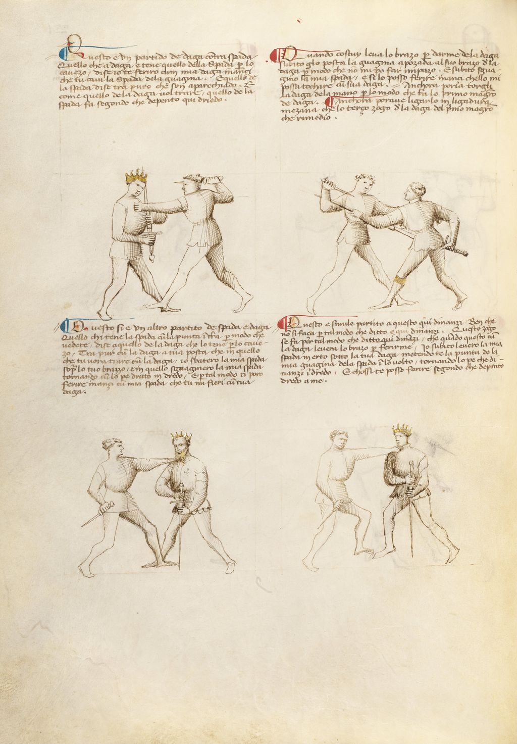 ¶ Questo è un partido de daga contra spada. Quello che à daga e tene quello della Spada per lo cavezo, dise io te ferirò cum mia daga inanci che tu cavi la Spada dela guagina. E quello de la spada dise tra' pure che son aparechiado. E come quello de la daga vol trare quello de la spada fa segondo ch'è depento qui driedo.