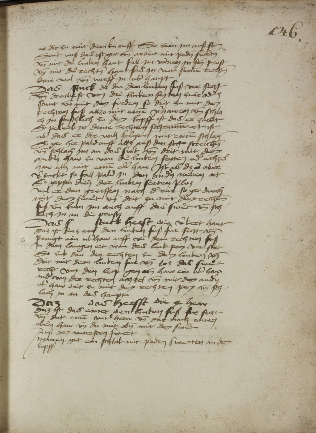 das s     stuck heist die v[er]kert hant daz ist daz ein[er] den linken fuß fur seczt vn[d] pringt ein ub[er]haw auff vn[d] dem rechten fuß jn dem langen ort wan das link pe[in] vor stet So zuk dan den rechten zu den linken vn[d] drit mit dem linken fur vn[d] laz das swe[r]t recht vm den leip gen vn[d] haw ein ob[er]haw nid[er] von der rechten achzel vn[d] mit dem and[er]n ob[er]haw drit zu mit dem rechten pe[in] vn[d] sch/lach jn in das haupt