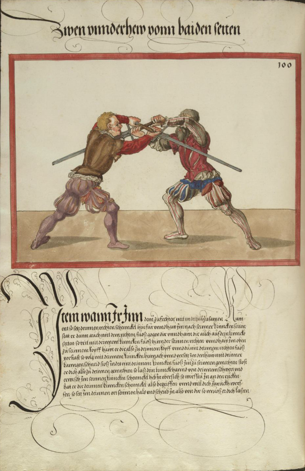 Item wann Ir Inn dem zufechten mit vnderhaw_ zusamen Kument. so setz deinnen rechten schennckel hinfur vnnd haw Im nach seinner Linncken seiten. stat er dann auch mit dem rechten fuosz gogen dir vnnd hawt dir auch auf dein linncke seiten. so trit mit deinnem Linncken fuosz hinnder seinnen rechten. vnnd haw Im oben zu seinnem kopff. hawt er dir also zu deinnem kopff. vnnd du mit deinnem rechten fuosz vorstast. so volg mit deinnem Linncken hinnach vnnd versetz Im den haw mit deinner Lanngen schneid. stosz Indes mit deinnem Linncken fuosz. Im zu seinNen gemechten. Stost er dich also zu deinnen gemechten. so lasz dein linncke hannd von deinnem schwert vnd erwisch Im seinnen Linncken schennckel. heb In vbersich. so wirffstu In an den rucken. hat er dir deinnen Linncken schennckel also begriffen. vnnd will dich zuruckh werffen. so setz Im deinnen ort seinnen hals vnd scheub In also von dir. so muosz er dich laszen.