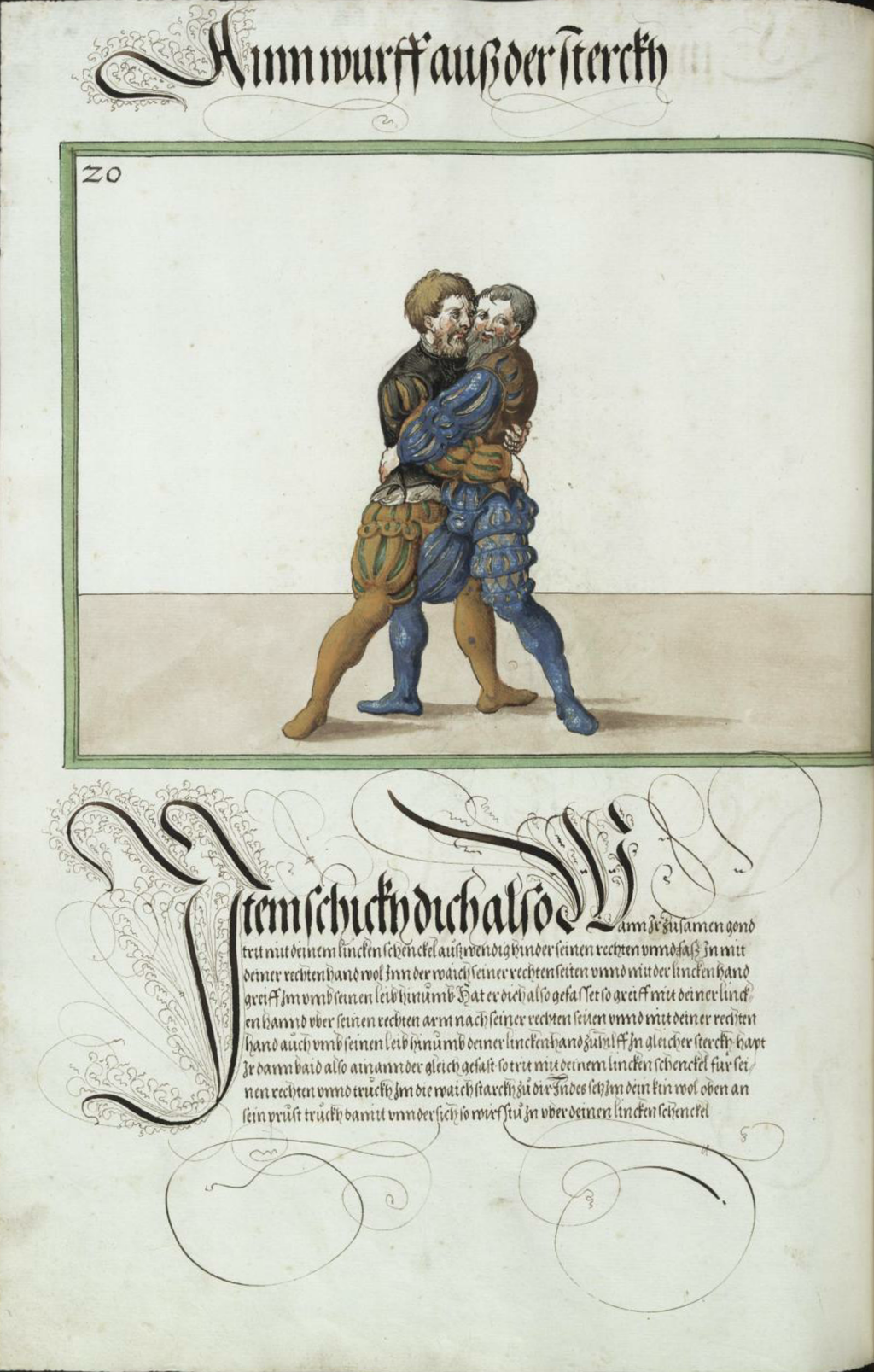 Item schickh dich also Wann Ir zusamen gond trit mit deinem lincken schenckel auszwendig hinder seinen rechten vnnd fasz In mit deiner rechten hand wol Inn der waich seiner rechten seiten vnnd mit der lincken hand greiff Im vmb seinen leib hinumb. hat er dich also gefasset so greiff mit deiner lincken hannd vber seinen rechten arm nach seiner rechten seiten vnnd mit deiner rechten hand auch vmb seinen leib hinumb deiner lincken. hand zu hilff In gleicher sterckh. hapt Ir dann baid also ainannder gleich gefast. so trit mit deinem lincken schenckel fur seinen rechten vnnd truckh Im die waich starckh zu dir Indes setz Im dein kin wol oben an sein prust truckh damit vnndersich. so wirfstu In vber deinen lincken schenckel