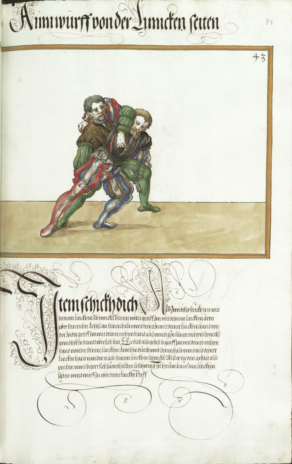 Item schickh dich Also Inn dises stuckh trit mit deinem linckhen schennckel hinein. vnnd greiff Im mit deinem linckhen arm vber sein rechte Achsel an seinne hals. vnnd tring In mit deiner linckhen hand von dir Indes greiff Im mit deiner rechten hand auszwendig In seinen rechten schenckel. vnnd heb In damit vbersich. hat Er dich also gefast. so greiff Im mit deiner rechten hand vnnder seinem linckhen Arm hindurch vmb seinen hals. vnnd mit deiner lincken hand vnnder nach seinem linckhen schenckel Will er dir dein arbait also prechen vnnd begert sich zuenthallten. so schwing In herumb auf dein linckhen seiten. vnnd wirff In vber deine linckhe huff