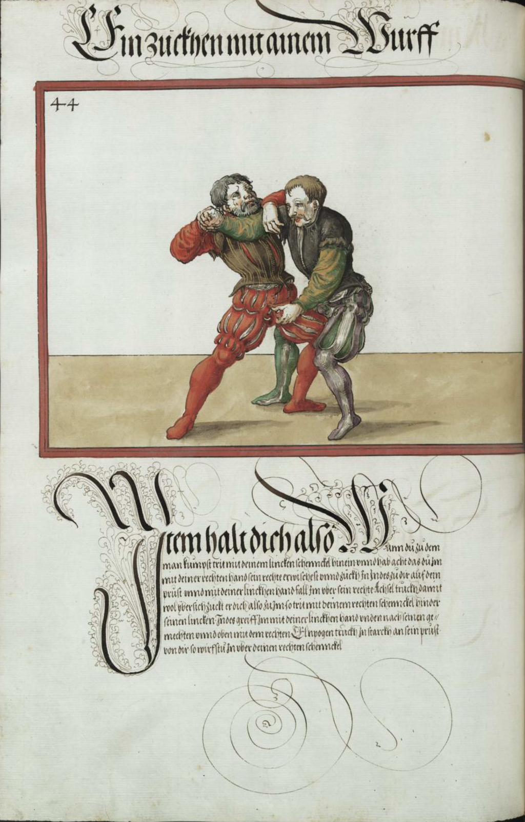 Item halt dich also Wann du zu dem man kumpst trit mit deinem lincken schennckel hinein. vnnd hab acht das du Im mit deiner rechten hand sein rechte erwischest vnnd zuckh In Indes zu dir auf dein prust. vnnd mit deiner linckhen hand fall Im vber sein rechte Achsel truckh damit wol ybersich zuckt er dich also zu Im. so trit mit deinem rechten schennckel hinder seinen lincken. Indes greiff Im mit deiner linckhen hand vnden nach seinen gemechten vnnd oben mit dem rechten Elnpogen truckh In starckh an sein prust. von dir. so wirffstu In vber deinen rechten schennckel