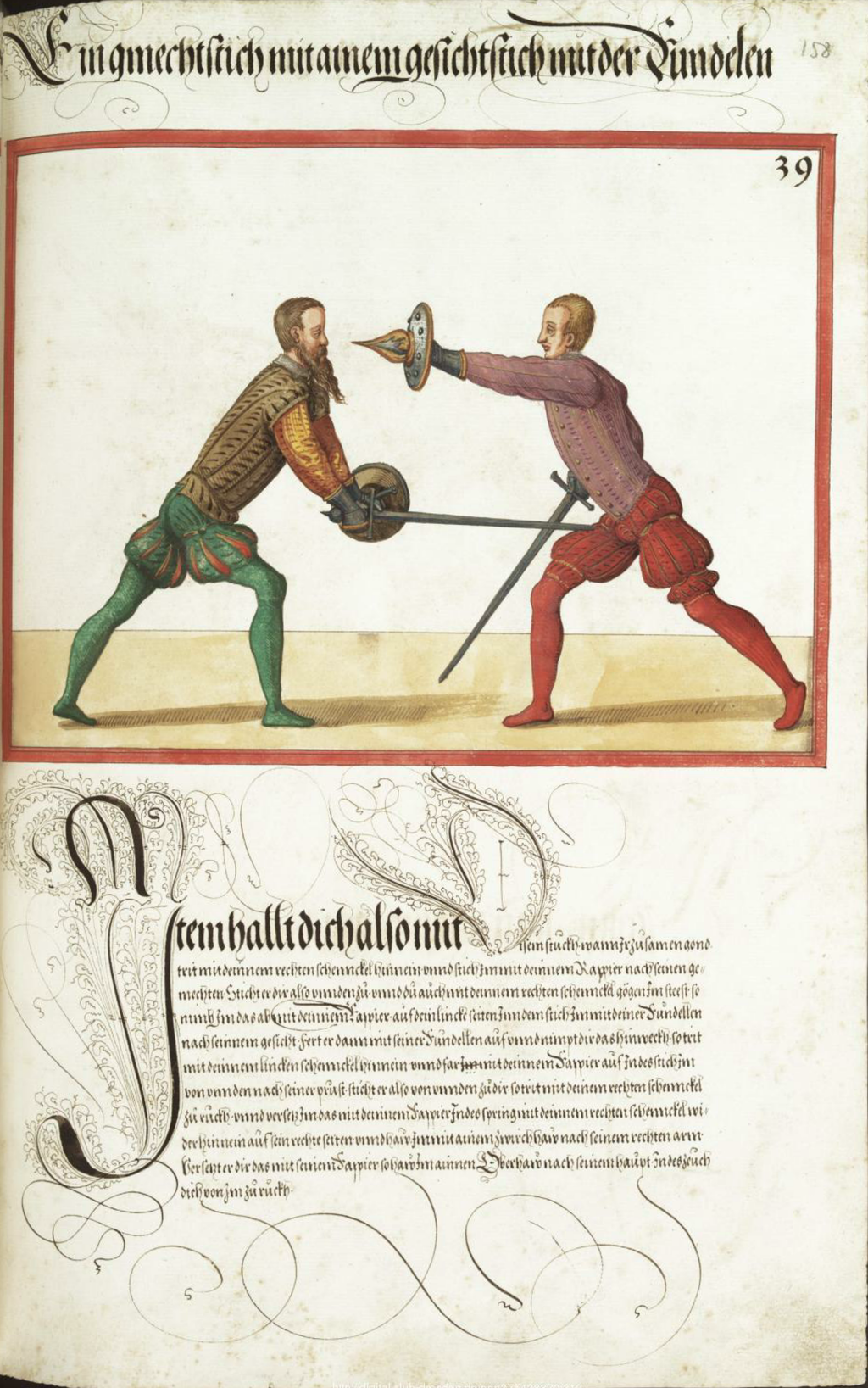 Item hallt dich also mit Disem stuckh. wann Ir zusamen gond. trit mit deinnem rechten schennckel hinnein. vnnd stich Im mit deinnem Rappier nach seinen gemechten. Sticht er dir also vnnden zu. vnnd du auch mit deinnem rechten shennckel gögen Im steest. so nimb Im das mit deinnem Rappier. auf dein lincke seiten Inndem stich Im mit deiner Rundellen nach seinnem gesicht. fert er dann mit seiner Rundellen auf vnnd nimpt dir das hinweckh. so trit mit deinnem lincken schennckel hinnein. vnnd far Im mit deinnem Rappier auf. Indes stich Im von vnnden nach seiner prust. sticht er also von vnnden zu dir. so trit mit deinem rechten schennckel zu ruckh. vnnd versetz Im. das mit deinnem Rappier Indes spring mit deinnem rechten schennckel wider hinnein auf sein rechte seiten. vnnd haw. Im mit ainem zwirchhaw nach seinem rechten arm. Versetzt er dir das mit seinem Rappier. so haw Im ainnen Oberhaw nach seinem haupt. Indes zeuch dich von Im zu ruckh.