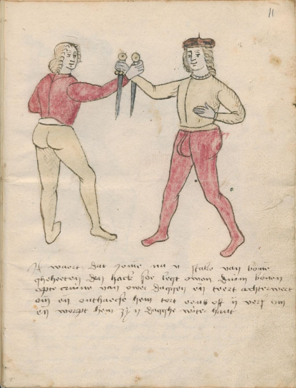 It[em] waert dat ieme na u stake van bove gheheeten den haek soe legt owen duim boven opte cruine van owen daggen en teert achterwert om en onthaecse hem tort eene oft ij vers om en worpst hem zijn Dagghe witer hant.