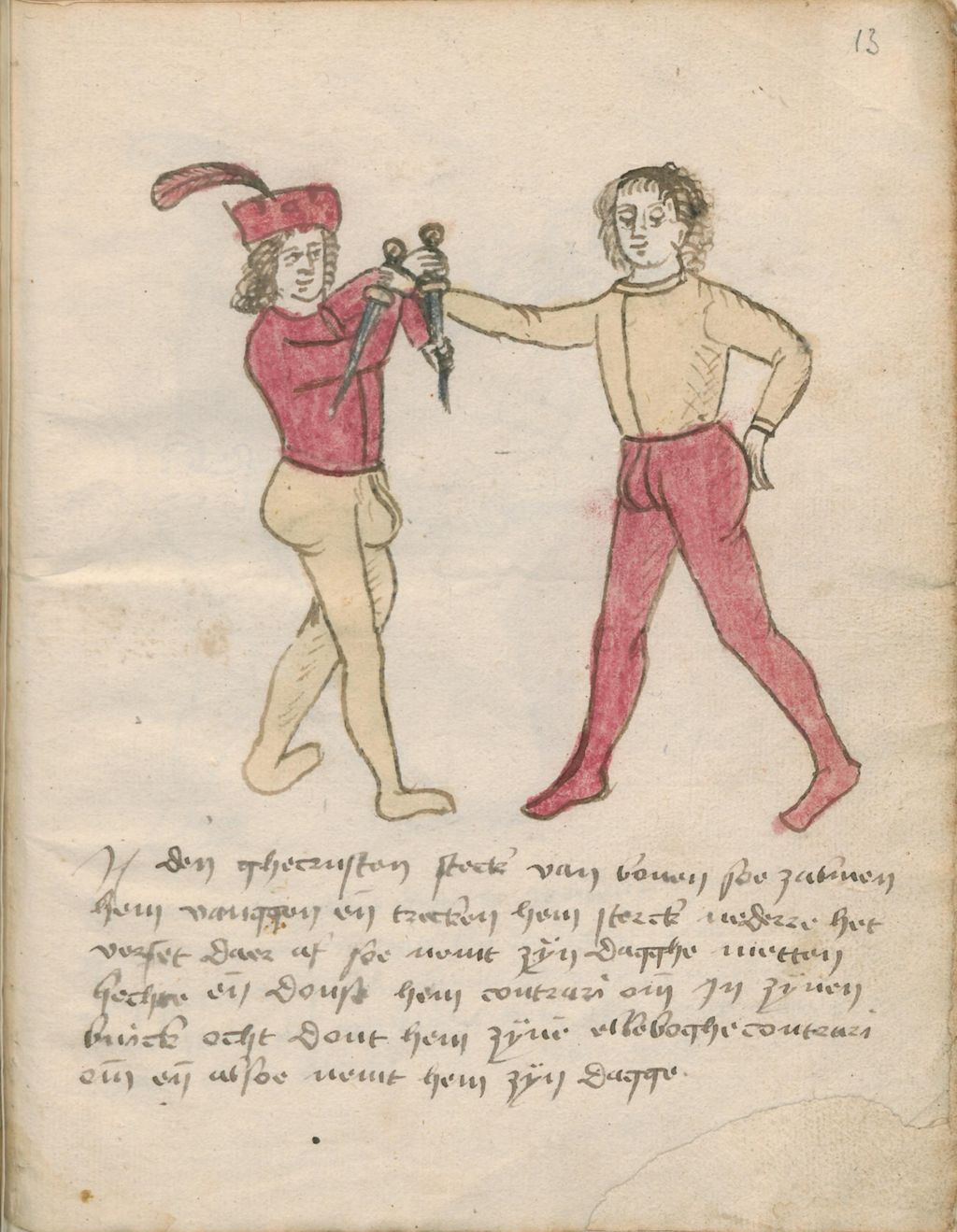 It[em] den ghecrusten steck van boven soe zalmen hem vanggen en trecken hem sterck nederre het verset daer af soe nemt zijn Dagghe metten [hechte] en dous hem contrari om in zijnen buick [ocht] dout hem zijne elleboghe contrari om en alsoe nemt hem zijn Dagge