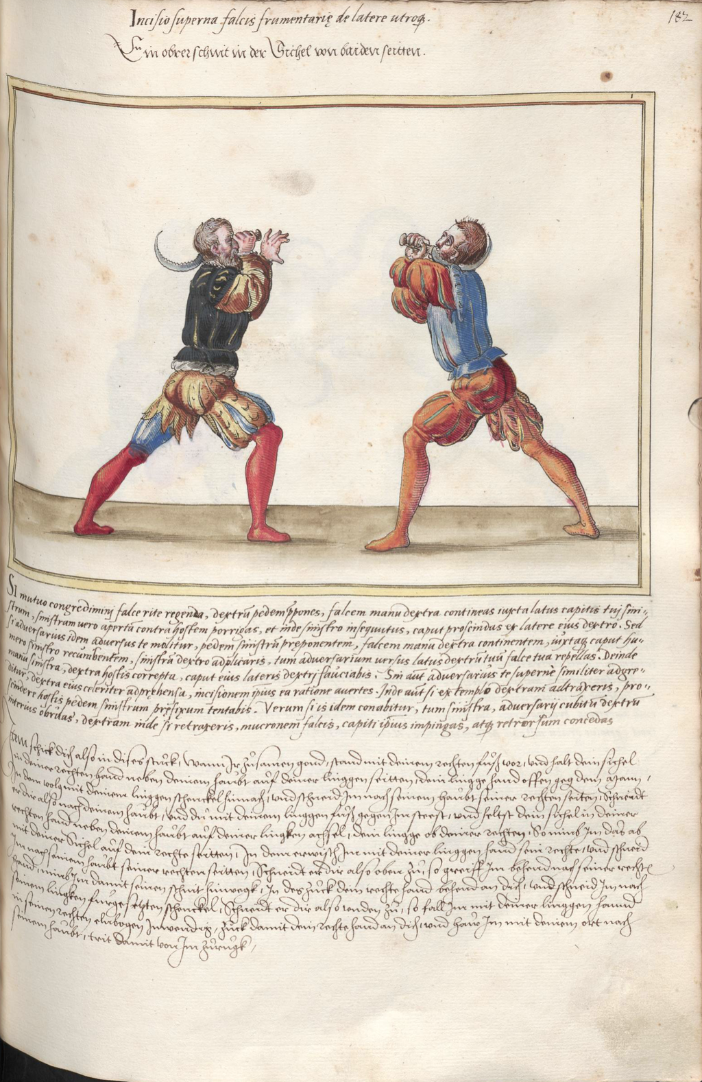 Item schick dich also in dises stu°ck, Wann Ir zu°samen gond, stand mit deinem rechten fu°ß vor, vnd halt dein sichel in deiner rechten hand neben deinem hau°bt au°f deiner linggen seiten, dein lingge hand offen geg~ dem Mann, In dem volg mit deinem linggen schenckel hinnach, vnd schneid Im nach seinem hau°bt seiner rechten seiten, Schneidt er dir also nach deinem hau°bt, vnd du° mit deinem linggen fu°ß gegen Im steest, vnd heltst dein sichel in deiner rechten hand neben deinem hau°bt au°f deiner lingken achsel, dein lingge ob deiner rechten, So nimb Im das ab mit deiner Sichel au°f dein rechte seitten, In dem erwisch Im mit deiner linggen hand sein rechte, vnd schneid Im nach seinem hau°bt seiner rechten seitten, Schneidt er dir also oben zu°, so greiff Im behend nach seiner rechte~ hand, nimb Im damit seinen schnit hinwegk, In des zu°ck dein rechte hand behend an dich, vnd schneid Im nach seinem lingken fu°rgesetzten schenckel, Schneidt er dir also vnden zu°, so fall Im mit deiner linggen hannd in seinen rechten elnbogen Inwendig, zu°ck damit dein rechte hand an dich, vnd haw° Im mit deinem ort nach seinem hau°bt, trit damit von Im zu°ru°gk,