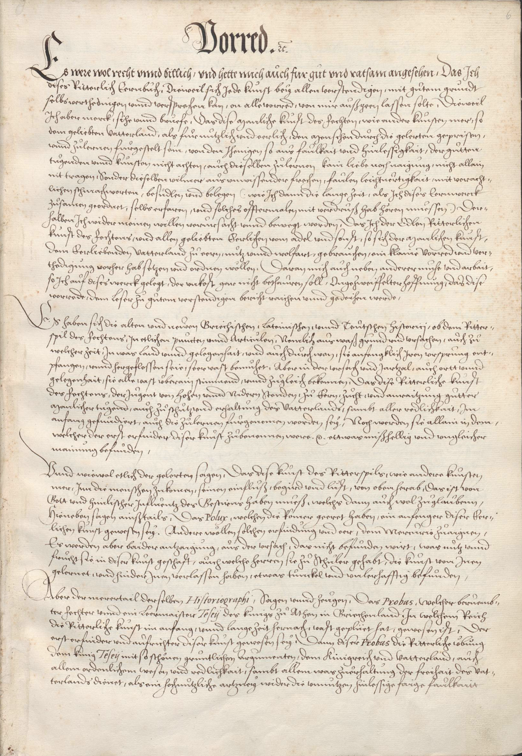 Es were nur recht und billich, und hette mich auch für gut und ratsam angesehsen, Das Ich dises ritterliche Eerenbuch, Dieweil sich jede kunst bey allen verstendigen, mit gutem grundt selbst vertheidigen und versprechen kan, on alle vorred, von mir aussgeen lassen solte. Dieweil ich aber merck, sihe und briefe, das dise manliche kunst des fechten, wie ander künsten mer, so dem geliebten vatterland, als für nutzliche und eerliche, den menschen durch die gelerten geprisen, und zu lernen furgestalt sein, von denjhenigen, so aus faulkait und hinlessigkait, der gutten tugenden und kunsten nicht achten, auch dieselben zu lernen kain liebe noch naigung, nicht allain nit tragen, sondern dieselben vilmer aus unwissender frechen, faulen leichtvertigkait, mit verachtlichen schmachworten, besudeln, und belegen (wie ich dann die lange zeit, als ich dises Eerenwerck zusamen geordnet, selbst erfahren, und solches offtermalen mit verdruss hab horen mussen) Derhalben ich wider meinen willen verursacht und bewegt worden, das ich der Edlen ritterlichen kunst des fechtens, und allen gelibten Eerlichen vom adel und sonst, so sich der manlichen kunst, dem Eerliebenden vatterland zu eeren, nutz und wolfart gebrauchen, ein klaine vorred und vertheidigung vorher hab setzen und ordnen wollen. Daran mich auch neben anderer muse und arbait, so ich auf dises werck gelegt, der unkost gar nicht beschauen soll, Ongezweiffelter hoffnung, das dise vorredt, dem leser zu gutem verstandigen bericht reichen und gedeihen werde.