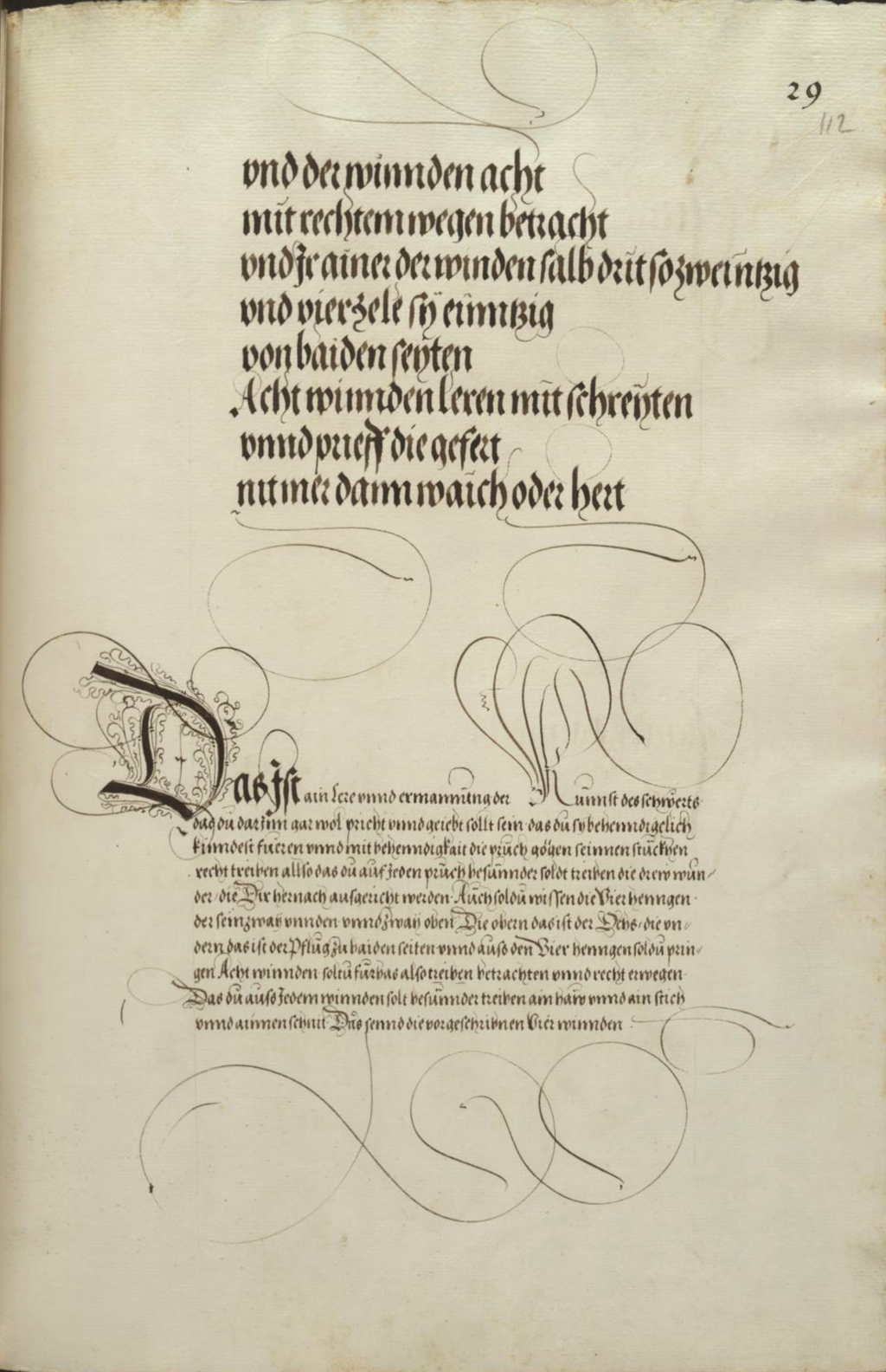 Das ist ain Lere vnnd ermannung. der Kunnst des schwerts. das du dar Inn gar wol pricht vnnd geiebt sollt sein. das du sy behenndigelich kinndest fueren vnnd mit behenndigkait die prüch gögen seinnen stuckhen recht treiben allso das du auf Jeden pruch besvnnder soldt treiben die drew wvnder / die Dir hernach ausgericht werden. Auch soldu wissen die Vier henngen. der sein zway vnnden. vnnd zway oben Die obern das ist der Ochs / die vndern das ist der Pflug zu baiden seiten. vnnd auss den Vier henngen soltu pringen Acht winnden. soltu furbas also treiben betrachten vnnd recht erwegen. Das du auss Jedem winnden solt besvnnder treiben ain haw vnnd ain stich vnd ainnen schnit. Das sennd die vorgeschribnen Vier winnden.