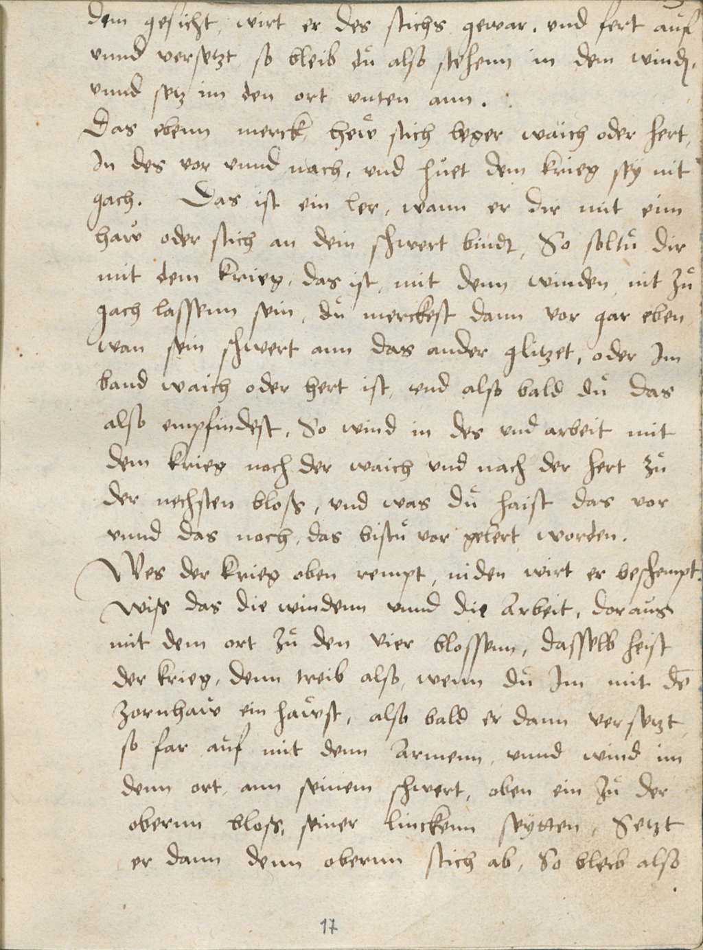Wiß das die windenn vnnd die Arbeit, doraus mit dem ort zu den vier blossenn, dasselb heist der krieg, denn treib also, wenn du Im mit dẽ zornhaw ein hawst, also bald er dann versetzt, so far auf mit denn Armenn, vnnd wind im denn ort, ann seinem schwert, oben ein zu der obernn bloß, seiner linckenn seytten, Setzt er dann denn obernn stich ab, So bleib also