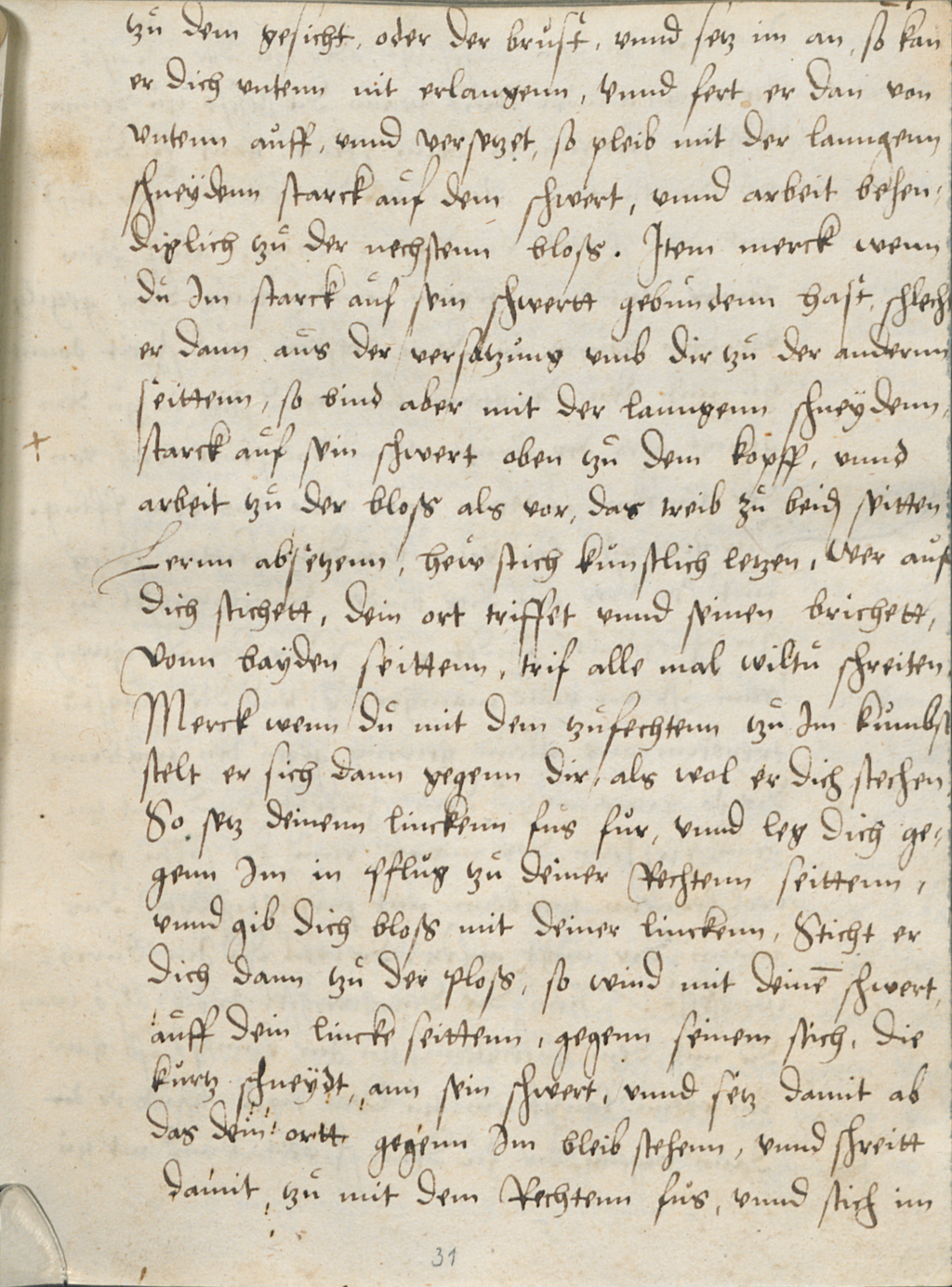 tzu dem gesicht, oder der brust, vnnd setz im an, so kan er dich vntenn nit erlangenn, vnnd fert er dan von vntenn auff, vnnd versetzet, so pleib mit der lanngenn schneydenn starck auf dem schwert, vnnd arbeit behendiglich tzu der nechstenn bloß. Item merck wenn du Im starck auf sein schwertt gebundenn hast, schlech[t] er dann aus der versatzung vmb dir tzu der andernn seittenn, so bind aber mit der lanngenn schneydenn, starck auf sein schwert oben tzu dem kopff, vnnd arbeit tzu der bloß als vor, das treib zu beid~ seitten