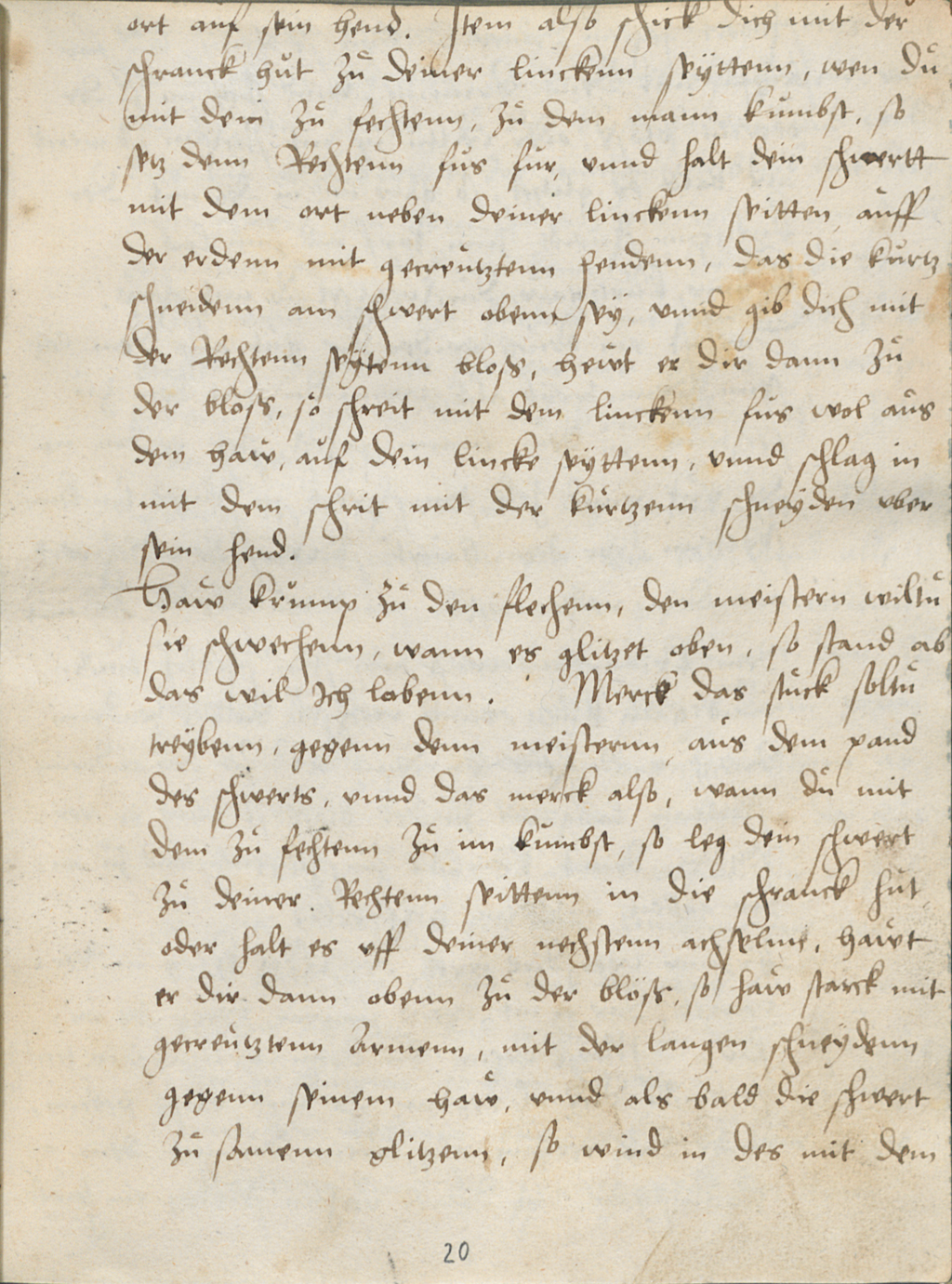 Merck das stuck soltu treybenn, gegenn denn meisternn, aus dem pand des schwerts, vnnd das merck also, wann du mit dem zu fechtenn zu im kumbst, so leg dein schwert zu deiner Rechtenn seittenn in die schranck hut, oder halt es vff deiner rechtenn achselnn, hawt er dir dann obenn zu der blöß, so haw starck mit gecreutztenn Armenn, mit der langen schneydenn gegenn seinem haw, vnnd als bald die schwert zu samenn glitzenn, so wind in des mit dem