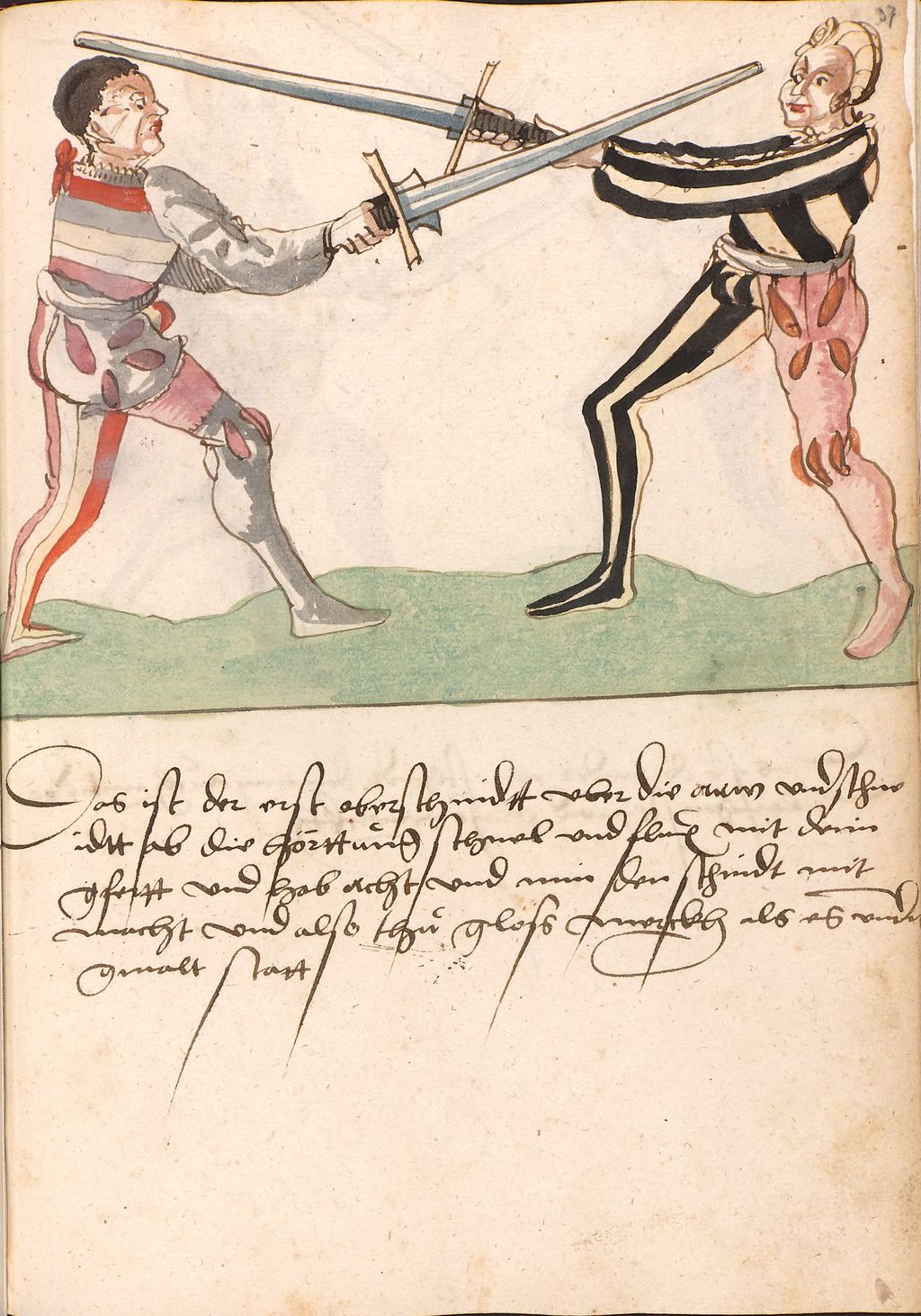 Das ist der erst oberschnidtt vber die arm vnd schneidtt ab die hörttung schnel vnd flux mit deim gfertt vnd hab acht vnd nim den schnidt mit macht vnd also thu glöss merckh als es vnd[ñ] gmalt statt