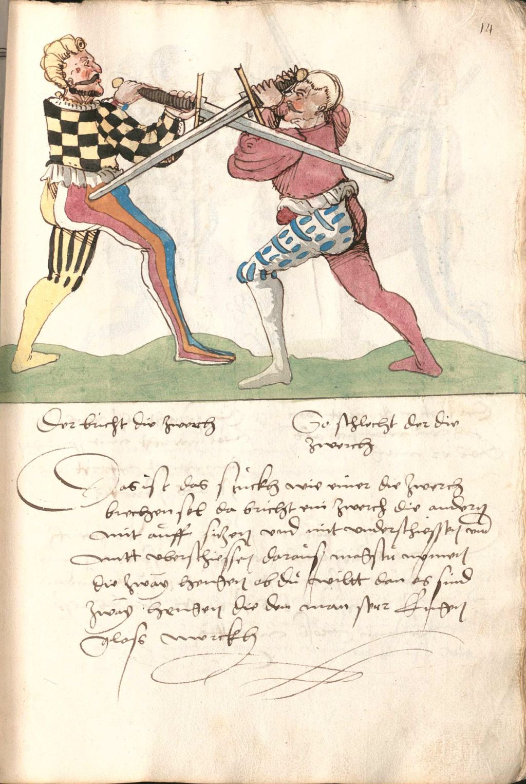 Das ist das stuckh wie einer die Zwerch brechen sol da bricht ein Zwerch die andern mit auff sitzen und mit underschiessen und mitt uberschiessen darauss magstu nemen die zway hengen ob du wiltt dan es sind zway hengen die den man ser Engen gloss merkh