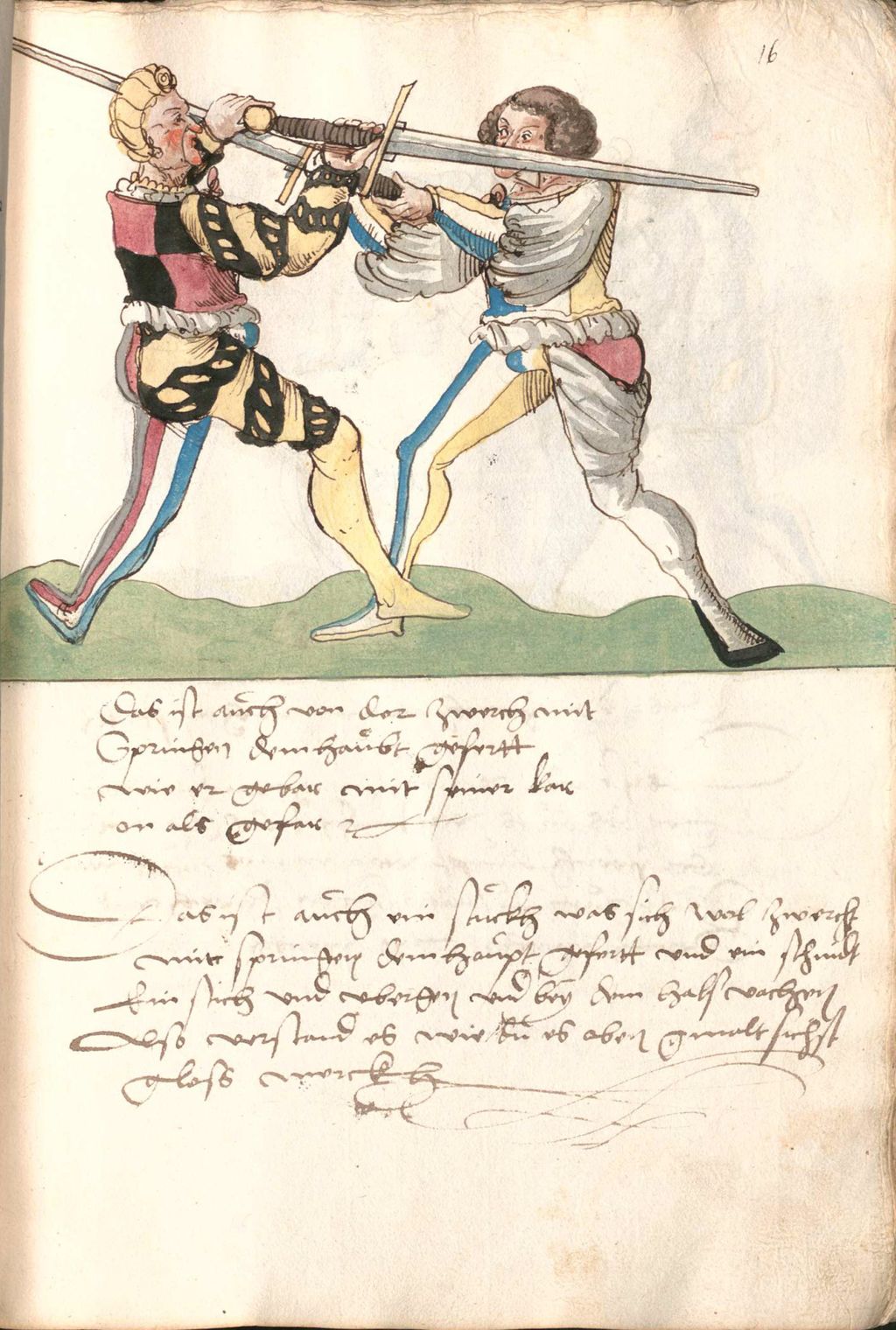 Das ist auch ein stuckh was sich wol zwercht mit springen dem haupt gefertt und ein schnidt Ein stich und ubergen und bey dem hals vachen Also verstand es wie du es oben gmalt sichst gloss merckh