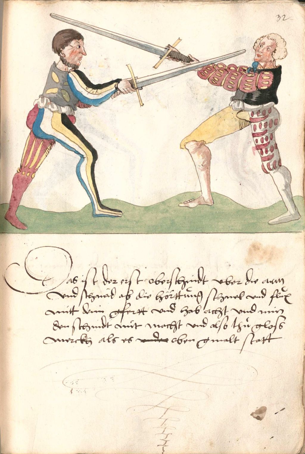 Das ist der erst oberschnidt uber die arm und schneid ab die hörttung schnel und flul mitt dein gfertt und hab acht und nim den schnidt mit macht und also zu thu gloss merckh als es unden oben gmaltt statt