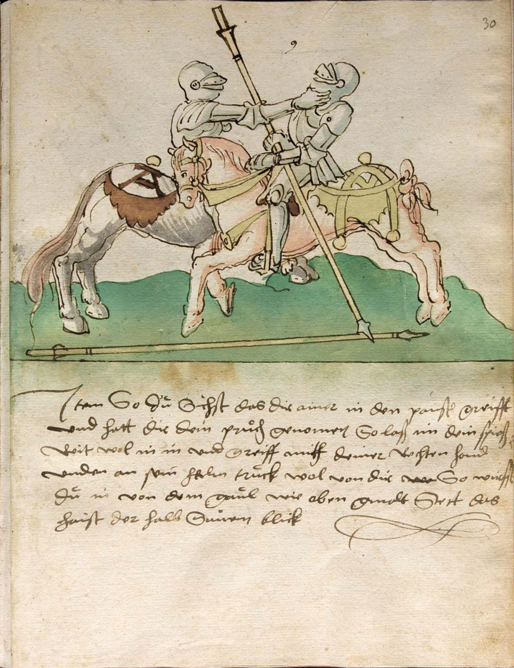 Item So du Sichst das dir ainer in den pausch greifft vnd hatt dir dein pruch genomen So laß im dein spieß Reit wol in in vnd Greiff mitt[1] deiner Rechten hand vnden an sein helm truck wol von dir wo So wirfst du in von dem gaul wie oben gmalt Stett das haist der halb Sunen blick