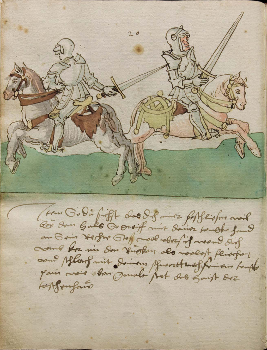 Item So du sichst das sich ainer beschliesen wil beÿ dem hals So greiff mit deiner tengke hand an Sein Rechter Stoß wol vbersich wend dich vmb ker im den Rugken als welest fliechen vnd schlach mit deinem schwertt nach seinem tengks pain wie oben gmalt stet das haist der taschenhaw