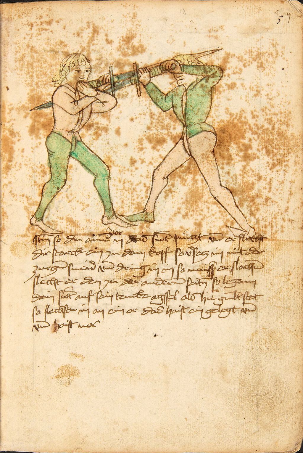 Item so du ainen in das swert pinczt (bindest) und er slecht dir starck ein zu dem kopf, so versecz in mit der zurczen (kurzen) sneid und dring in in, so muß er slachen. Slecht er den zu der andern seiten, so lege im dein swert anf sein tencke agssel, als hie gemalt stet, so slechstu im an ein or. Das haist eingelegt und haist vor.