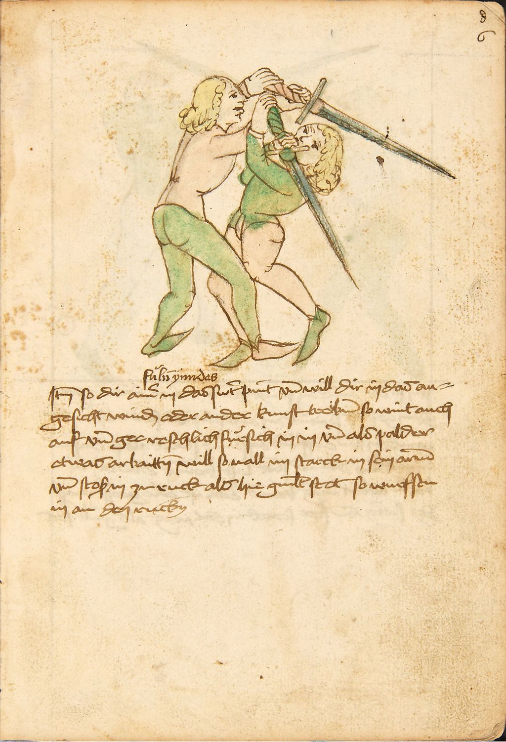 Item so dir ainer in das swert pint und will dir in das angesicht winden oder ander kunst treiben, so wint auch aus und gee reschlich für sich in in und, als pald er etwas arbaitten will, so vall im starck in sein armen und stoß im zuruck, als hie gemalt stet, so wurfstu in an den rucken.