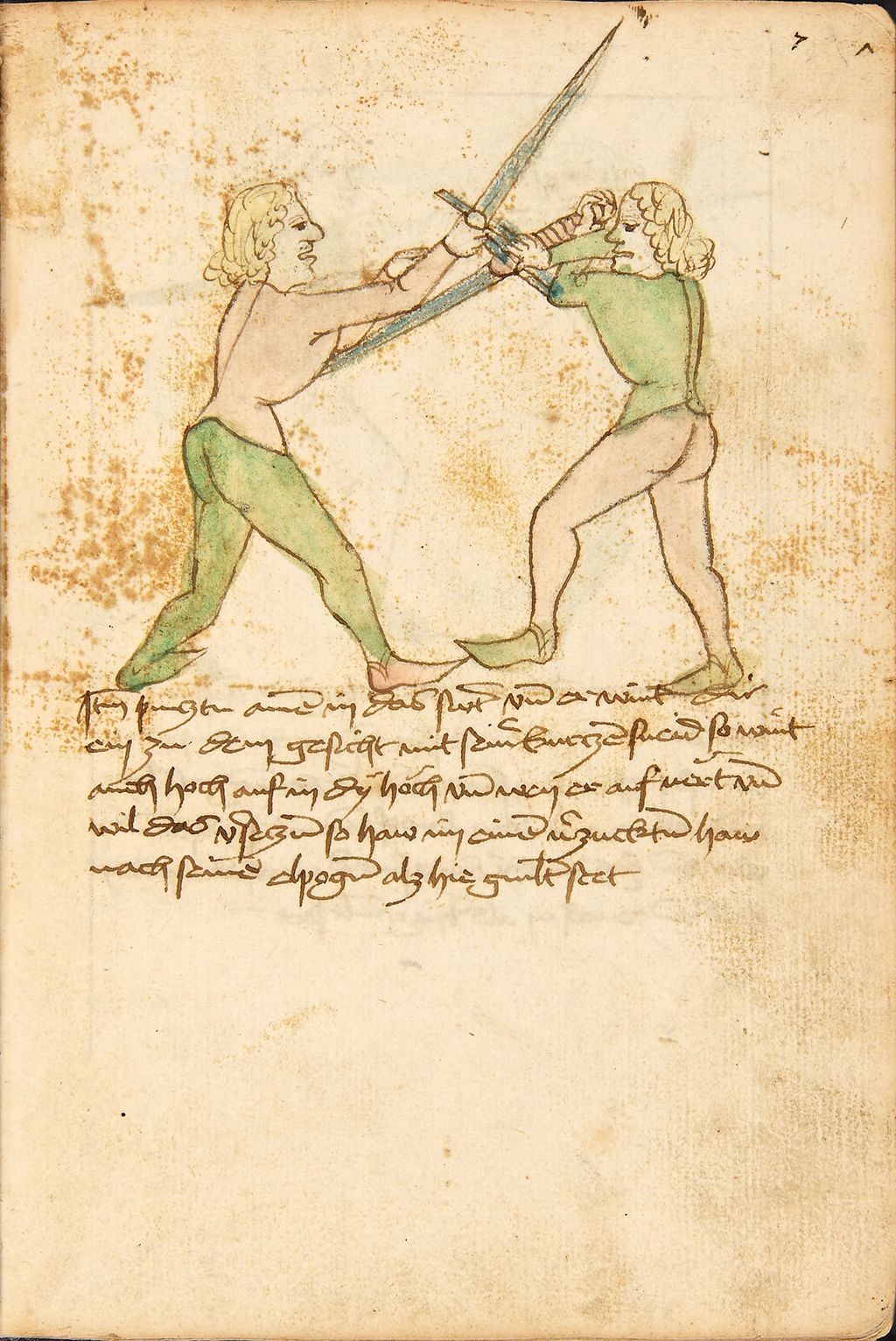 Item pincztu ainem in das swert und er wint dir ein zu dem gesicht mit seiner kurczen sneid, so wint auch hoch auf in dy hoch und, wen er auf vert und wil das verseczen, so hau im einen verzuckten hau nach seinen elpogen, alz hie gemalt stet.