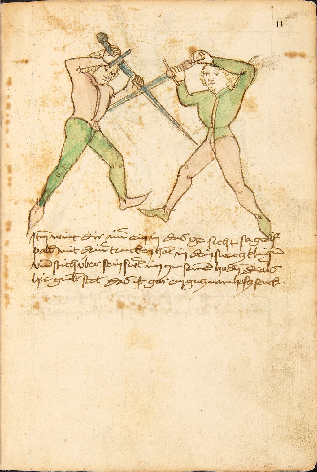 Item wint dir ainer ein in das gesicht, so greif bald mit deiner tencken hant in dein swercz klingen und stich über sein swert in zu seinen hoden, als hie gemalt stet. Das ist gar ein gucz namhaftes stuck.