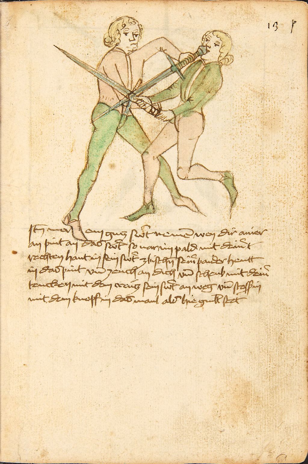 Item mer ein gucz swert nemen. Wen dir ainer an pint an das swert, so var pald mit deiner rechten hant in sein swert zbischen seiner paider hent in das pint und zeuch an dich und scheub mit deiner tencken mit dem creucz sein swert an weg und stoß in mit dem knopf in das maul, als hie gemalt stet.
