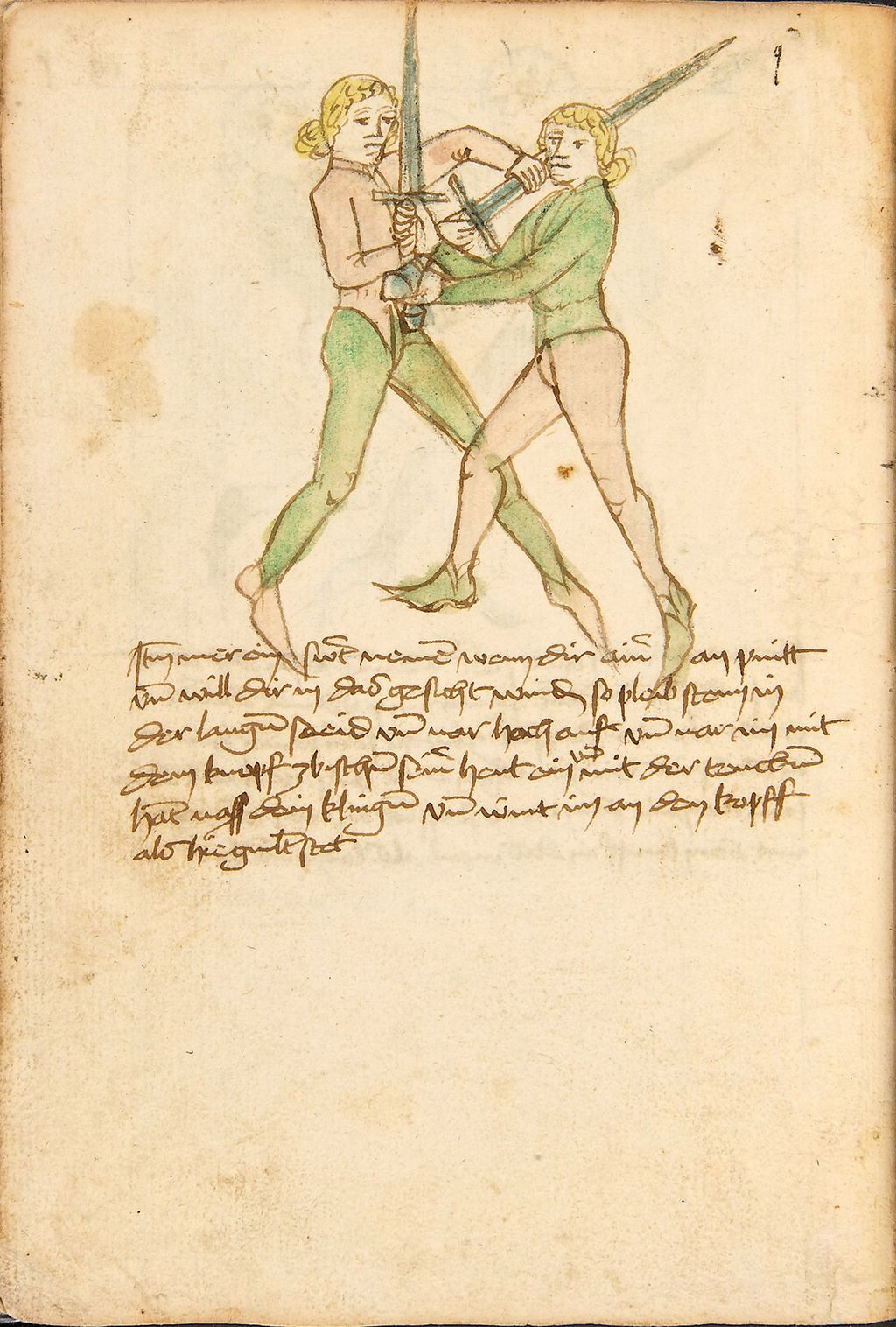Item mer ein swert nemen. Wen dir ainer an pint und wil dir in das gesicht winden, so pleib sten in der langen sneid und var hoch auf und var im mit dem knopf zbischen sein hent ein und mit der tencken hant vaß dein klingen und wint im an den kopf, als hie gemalt stet.