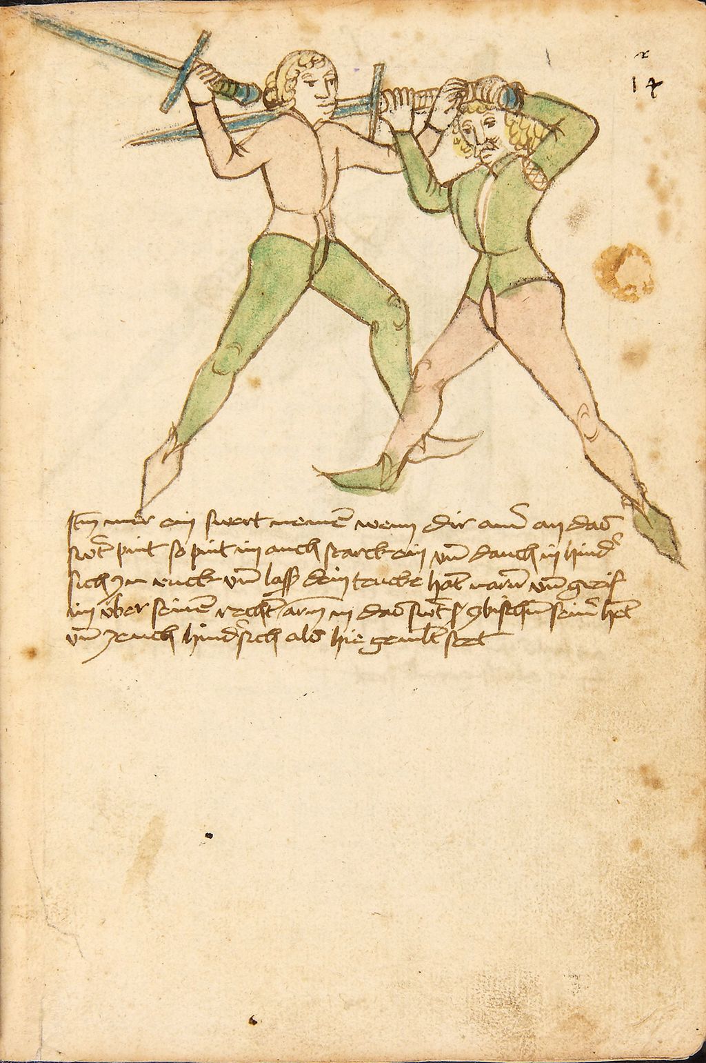 Item mer ein swert nemen. Wen dir ainer an das swert pint, so pint in auch starck ein und dauch in hinder sich zuruck und laß dein tencke hant varen und greif im über sein rechten arm in das swert zbischen seiner hent und zeuch hinter sich, als hie gemalt stet.