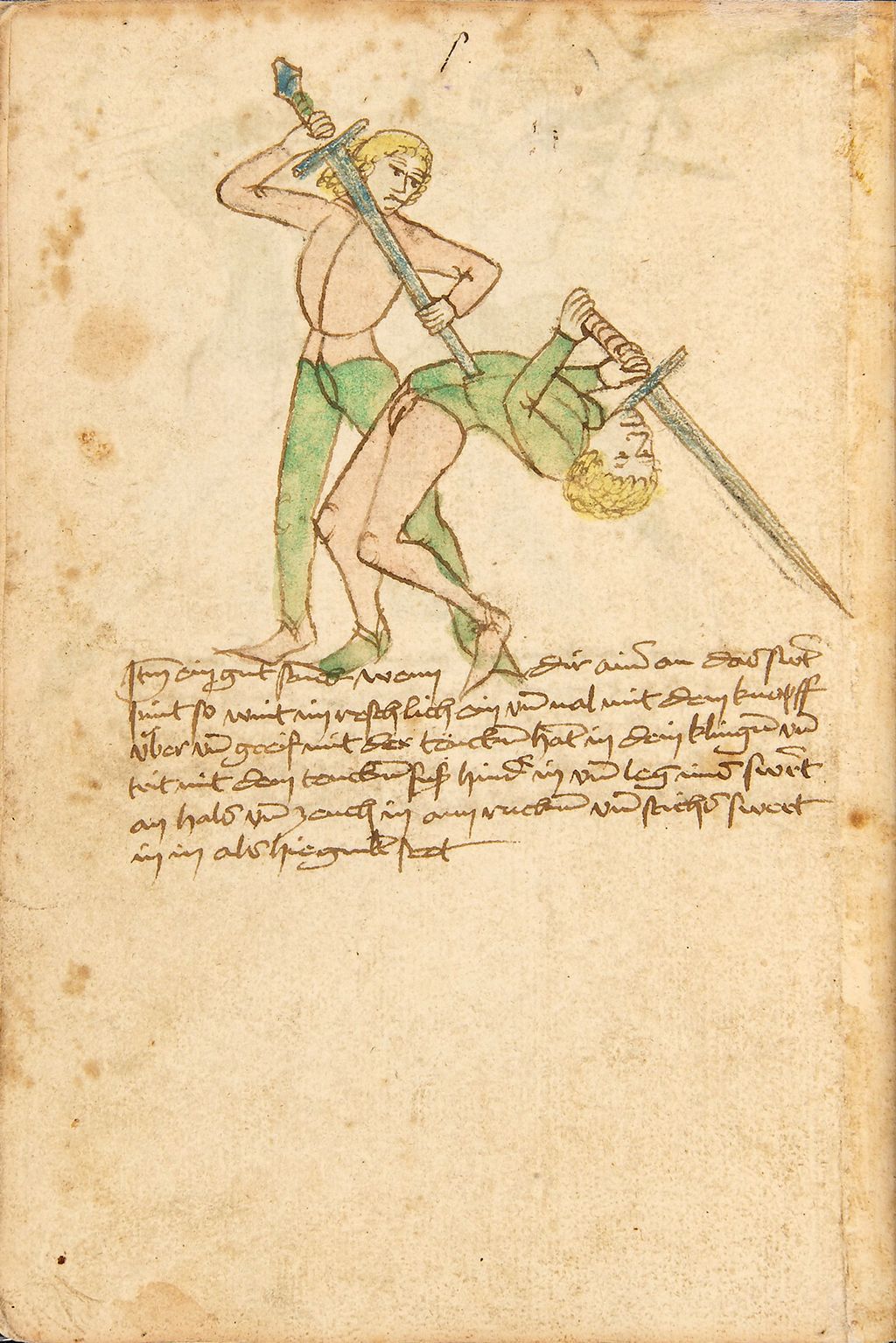 Item ein gut stuck. Wenn dir ainer an das swert pint, so wint im reschlich ein und val mit dem knopf über und greif mit der tencken hant in dein klingen und trit mit dem tencken fuß hinder in und leg ims swert an hals und zeuch in an rucken und stichs swert in in, als hie gemalt stet.
