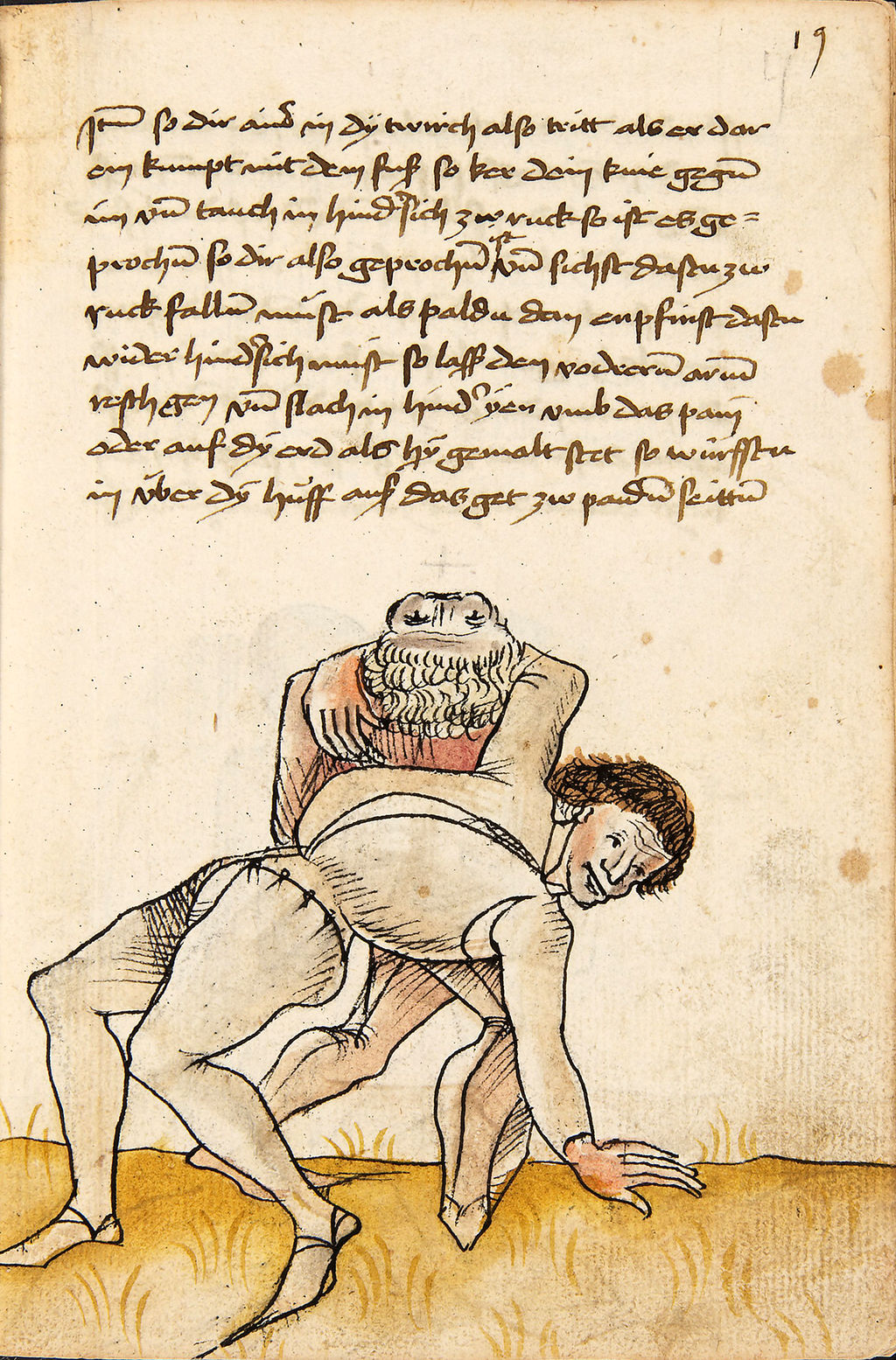 Item so dir ainer in dy twirch also tritt als er dar ein kumpt mit dem fuß so ker dein knie gegen im vnd tauch in hindersich zw ruck so ist es ge- prochen so dir also geprochen ist vnd sichst dastu zw ruck fallen müst als paldu dan enpfinst dastu wider hindersich müst so lasß den vodreren armen resch gen vnd slach in hinder yen vmb das pain oder auf dy erd als hy gemalt stet so würfstu in über dy hüff auß das get zw paiden seitten