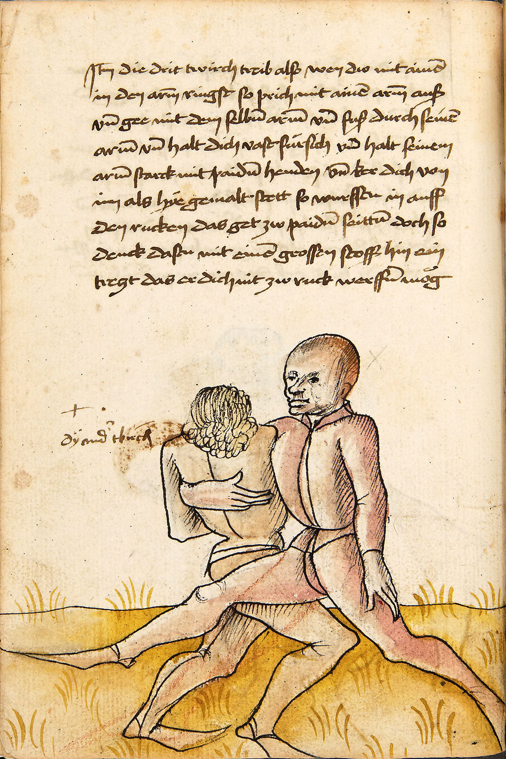 Item die drit twirch treib also wen dw mit ainem in den armen ringst so prich mit ainem armen auß vnd gee mit dem selben armen vnd fuß durch seinen armen vnd halt dich vast fürsich vnd halt seinem armen starck mit paiden henden vnd ker dich von im als hye gemalt stett so wurfstu in auff den rucken das get zw paiden seitten doch so denck dastu mit einem grossen stosß hin ein treczt das er dich nit zw ruck werffen mög