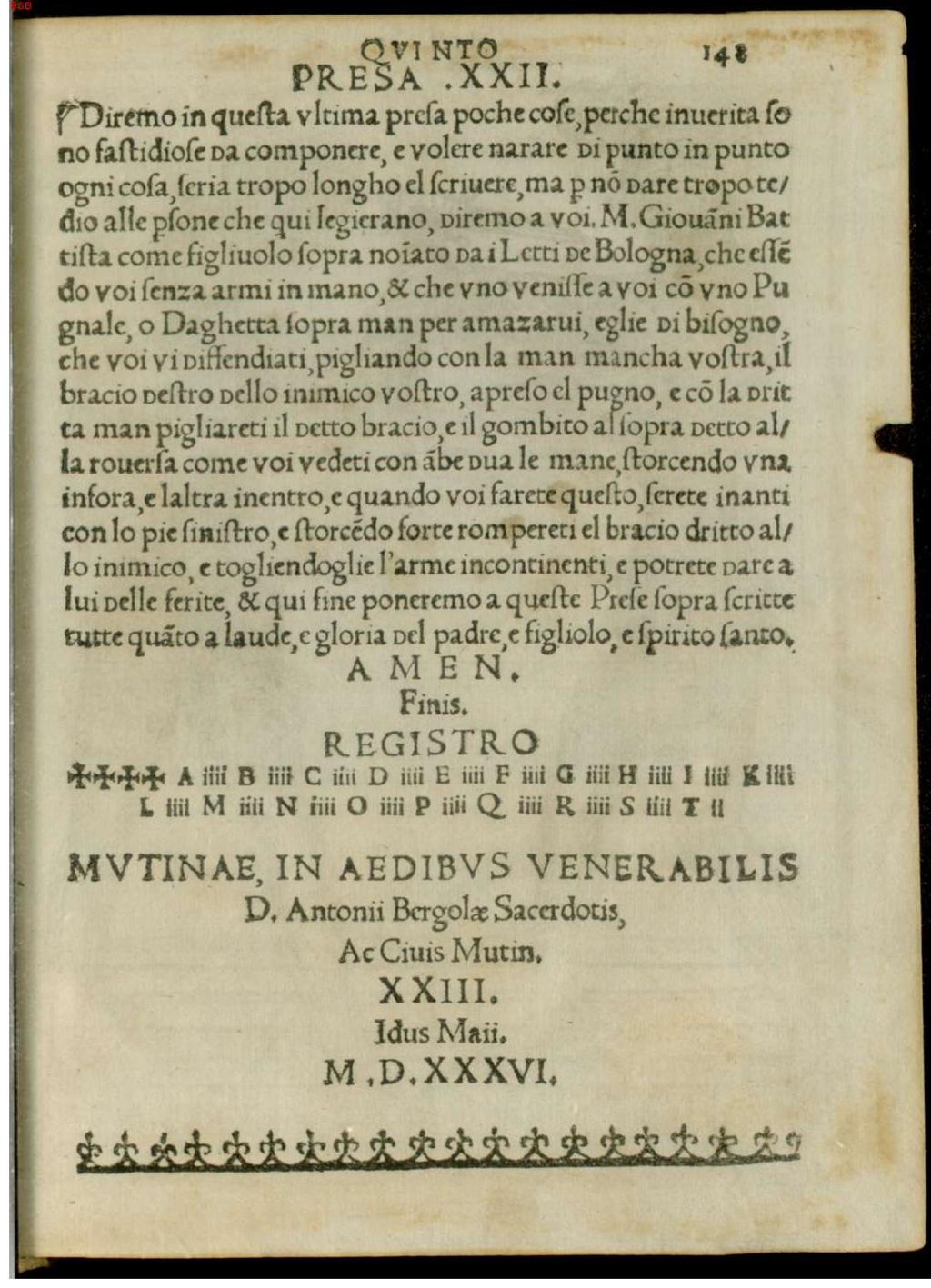 Diremo in questa ultima presa poche parole: in verità sono fastidiose da componere & voler narrare di ponto in ponto ogni cosa seria troppo lungo il scrivere; ma per non dare troppo tedio alle persone che quivi leggeranno, diremo a voi M. Giovanbattista, come figliuolo sopra a nominato, da i Letti di Bologna, ch’essendo voi senz’armi in mano & che uno venisse a voi, un pugnale o daghetta sopra mano, per ammazzarvi, gli è di bisogno che voi vi diffendiate pigliando con la vostra man manca il braccio destro dello nimico vostro, appresso il pugno & con la man dritta pigliarete il ditto braccio & il gombito al predetto alla roversa, come voi vedete, con ambedue le mani, torcendo una in fuori & l’altra in dentro: quando voi farete questo, fatevi innanzi col piè sinistro & torcendo forte romperete il braccio dritto al nimico, togliendoli l’arme incontinente, & potrete dare a lui delle ferite; & quivi poneremo fine a queste prese soprascritte, tutte quante a laude et gloria del Padre, del Figliuolo & del Spirito Santo.