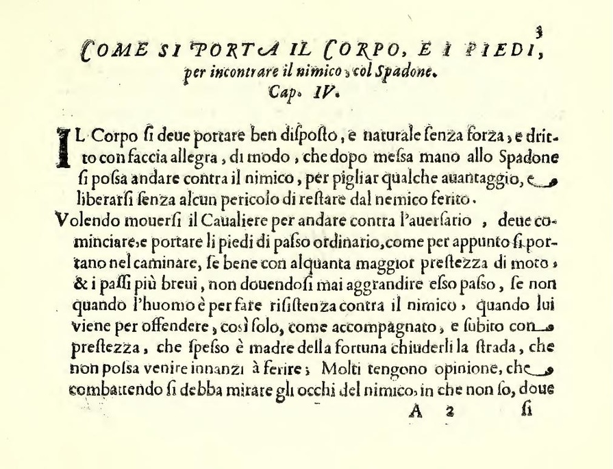 Volendo mouerfi il Caualiere per andare contra l’auerlàrio , deueco- minciare»e portare li piedi di pafso ordinario,come per appunto fipor- tano nel caulinare, fe bene con alquanta maggior prefteZZa di moro * & i palli più breui , non douendofi mai aggrandire elsa palso , fe non quando l’huomoèperfare ri fi Iten za contra il nimico» quando lui Viene per offendere 4 così folo» Come accompàgnato * e lùbito coruai preftezZa, che Ipefso è madre della fortuna chiuderli la lìrada, che