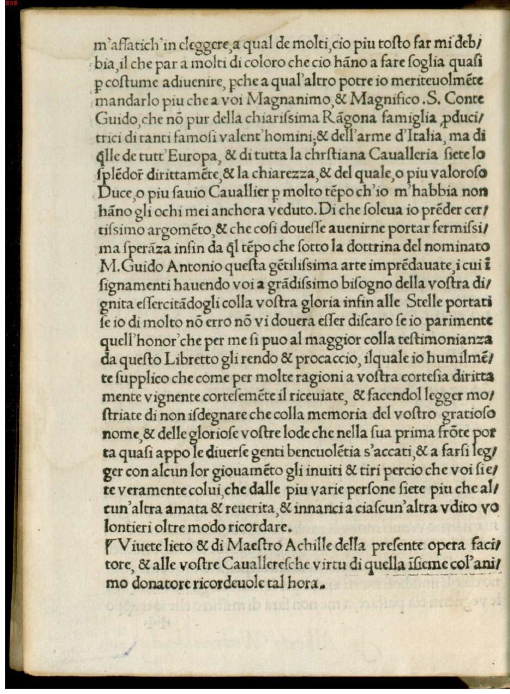 Vivete lieto & di Maestro Achille della presente opera facitore &, alle Vostre Cavalleresche virtù, di quella insieme, con animo donatore, ricordevole talhora.
