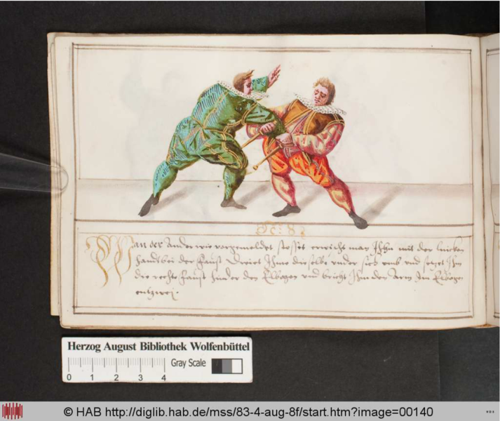 Do you have permission to re-use this image? Just because scans appear on Wiktenauer does not mean that they are free to use. Wiktenauer is a 501(c)(3) nonprofit, and many of the scans we host are only licensed for nonprofit use. In other cases, the scans have no standard license and Wiktenauer has received special permission to host them (and can't grant that permission to anyone else). The license terms appear in the Copyright and License Terms box at the bottom of the page that sent you here. When in doubt, always check with the museum or library that owns a manuscript before publishing or otherwise reusing its scans. |