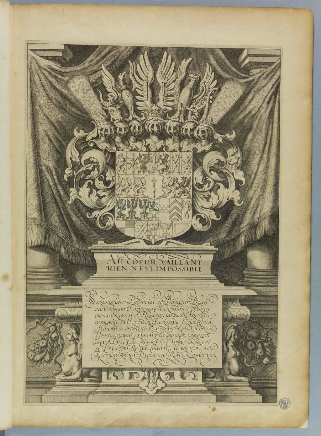 Serenissimo Principi ac Domino Domino Georgio Guiliermo Marchioni Brandenburgensi S. Romani imperii Archicamerario et Electori; Borussiæ, Juliæ, Cliviæ, Montium, Stetini, Pomeraniæ, Cassubiorum, Vandalorum et in Silesia Crosnæ, Carnoviæ’que Duci: Burggravio Norimbergensi Principi Rugiæ: Comiti Marchiæ Ac Ravensbergi: Dynastæ Ravensteiny, &c.