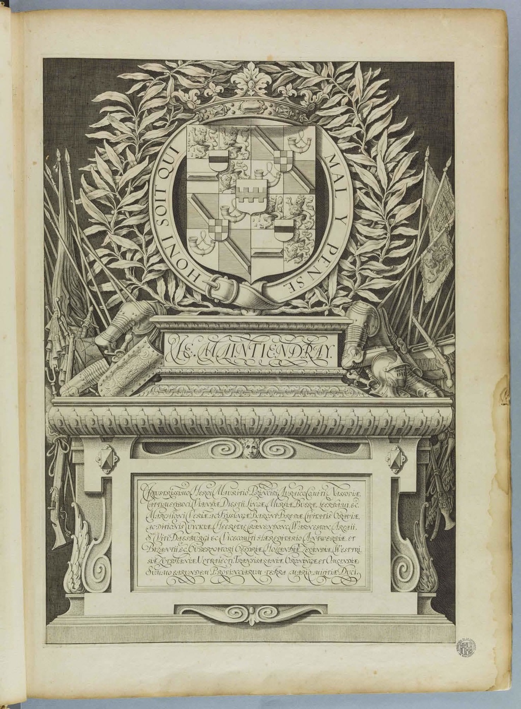 Illustrissimo Heroi Mauritio Principi Auraico; Comiti Nassoviæ, Cattimeliboci, Viandæ, Diestii, Lingæ, Mursiæ, Bueræ, Leerdami, &c. Marchioni Veriæ, ac Flissingæ; Baroni Bredæ, Civitatis Graviæ, ac ditionis Cuyckiæ, Heerstal, Cranendonc, Warneston, Arlaii, Sti Viti, Daesburgi ec. Vicecomiti Hæreditario Antwerpiæ, et Bizantii, &c. Gubernatori Geldriæ, Hollandiæ, Lelandiæ, West Frisiæ Lutphaniæ, Ultraiecti, Transisalaniæ, Groningæ et Omlandiæ; Summo earundem Provinciarum terra mariq; militiæ Duci.
