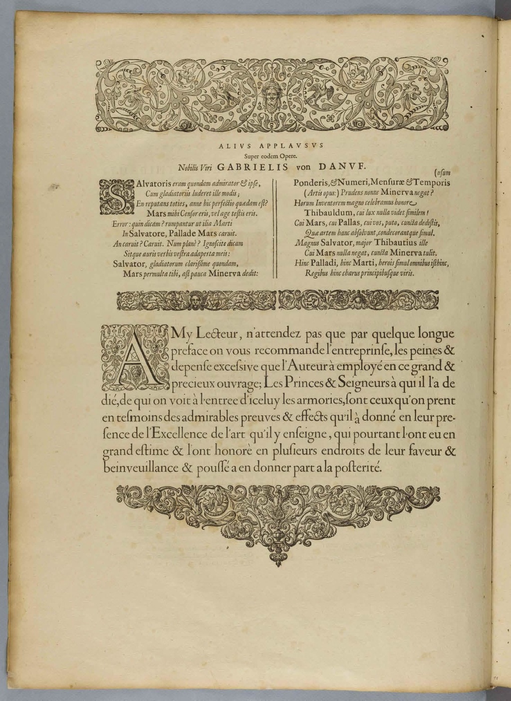 AMy Lecteur, n'attendez pas que par quelque longue preface on vous recommande l'entreprinse, les peines & depense excessive que l'Auteur à employé en ce grand & precieux ouvrage; Les Princes & Seigneurs à qui il l'a de dié, de qui on voit à l'entree d'iceluy les armories, sont ceux qu'on prent en tesmoins des admirables preuves & effects qu'il à donné en leur presence de l'Excellence de l'art qu'il y enseigne, qui pourtant l'ont eu en grand estime & l'ont honorè en plusieurs endroits de leur faveur & beinveuillance & poussé a en donner part a la posterité.