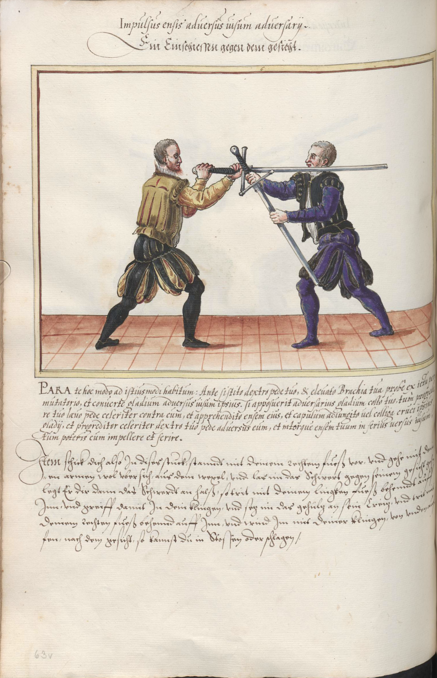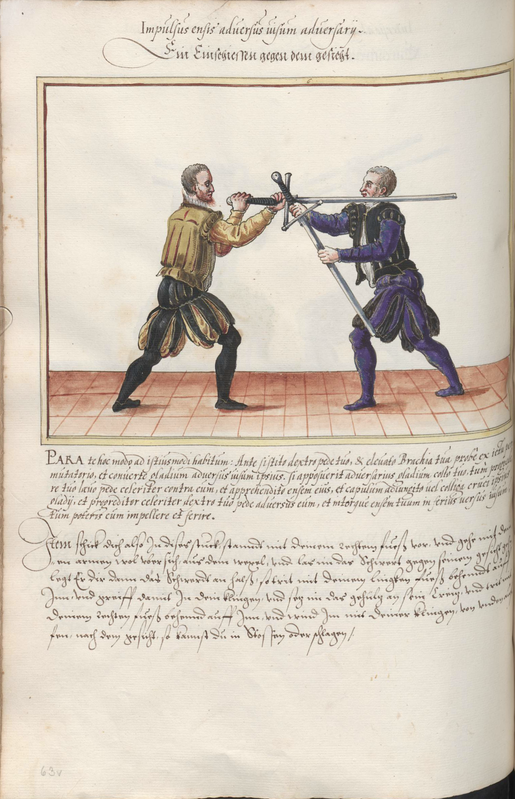 Item schick dich also in dises stück, stanndt mit deinem rechtem fueß vor, und gehe mit deinen armen wol uber sich, aus dem wexel, und las im das Schwert gegen seinem gesicht gehn, legt Er dir dann das Schwerdt an halß, so trit mit deinem lingken fueß behenndt auff Inn, und greiff damit In dein klingen, und sez im das gehülz an sein Creuz, und trit mit deinem rechten fueß behennd auff Inn, und wind Im mit deiner klingen, von unden auffen(?), nach dem gesicht, so kannst du in stossen oder schlagen /.